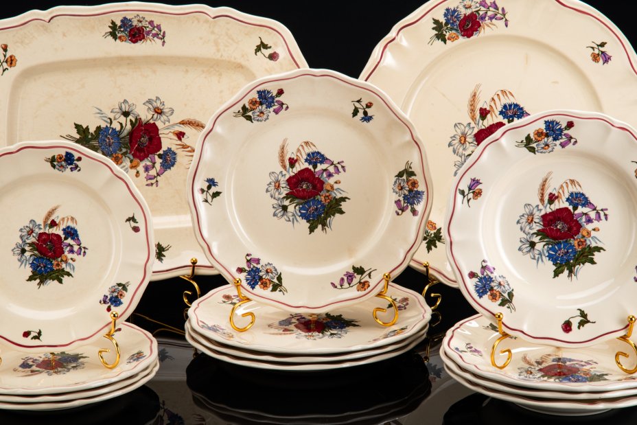 Набор обеденный с цветочным декором на 4 персоны (14 предметов), фаянс, деколь, Sarreguemines (Саргемин), Франция, 1980-2000 гг.