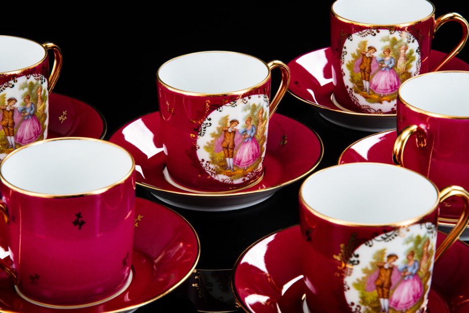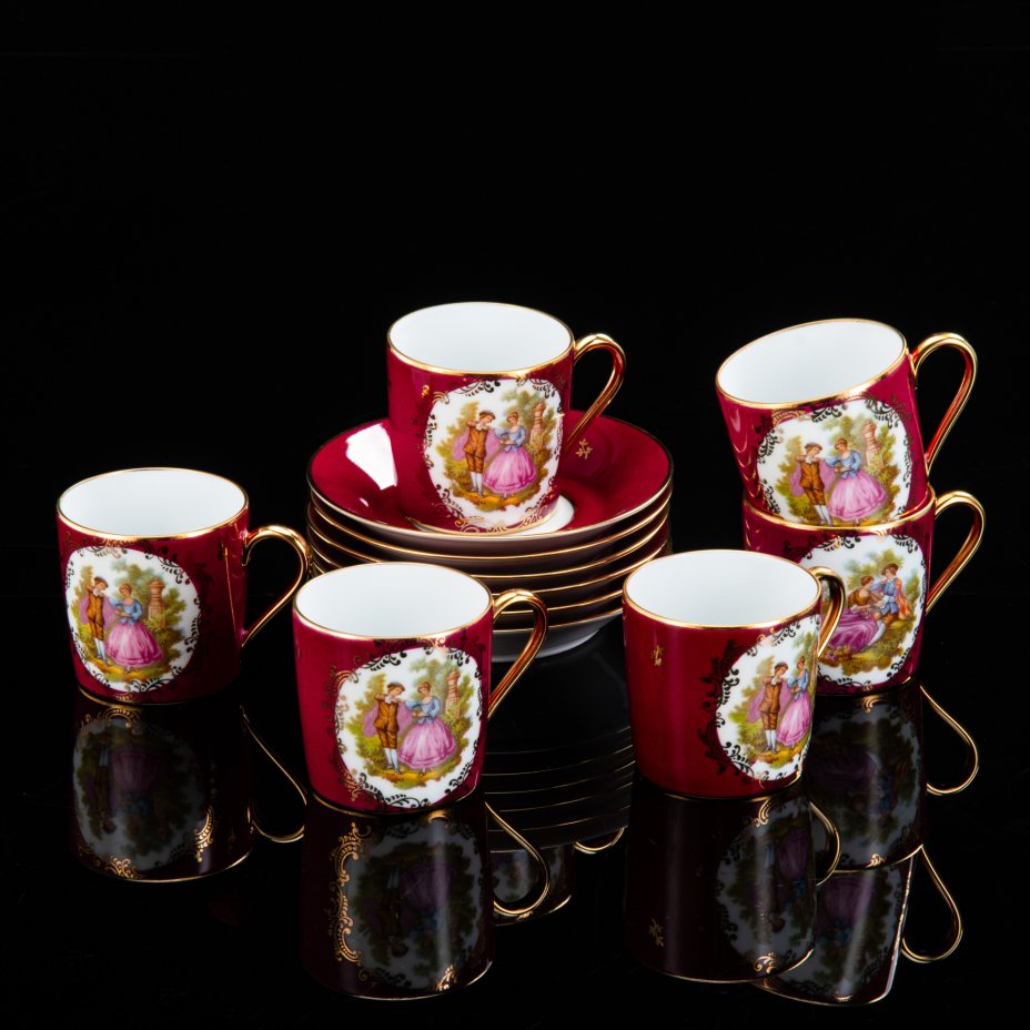 Набор кофейных пар на 6 персон, украшенных изображением галантной сцены, фарфор, деколь, крытье, золочение, Limoges, Франция, 1980-1990 гг.