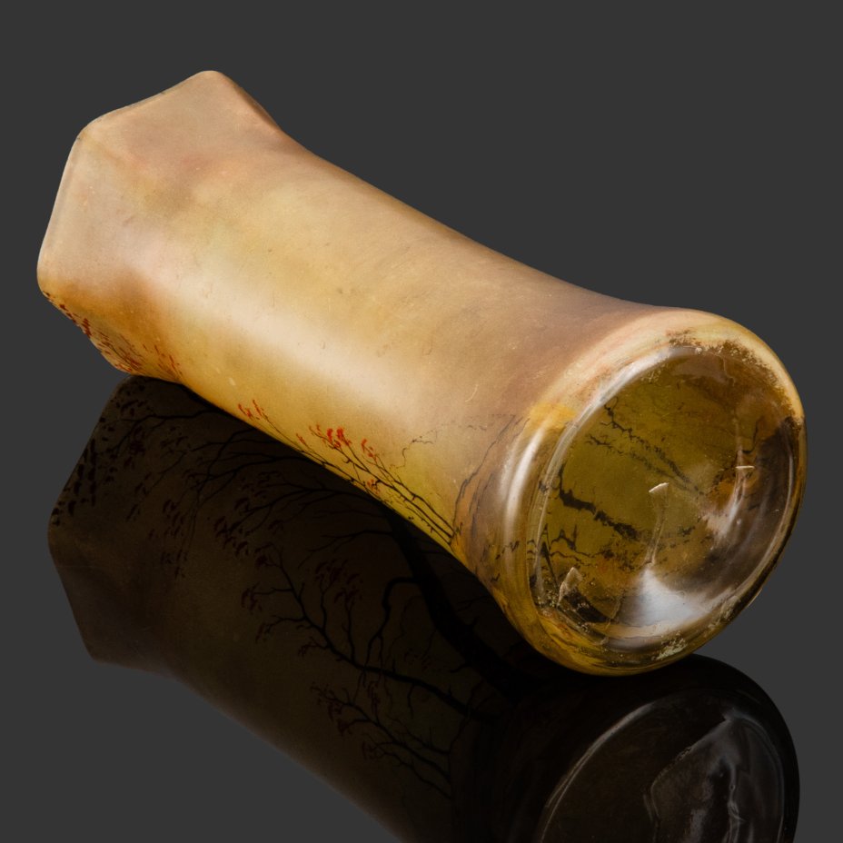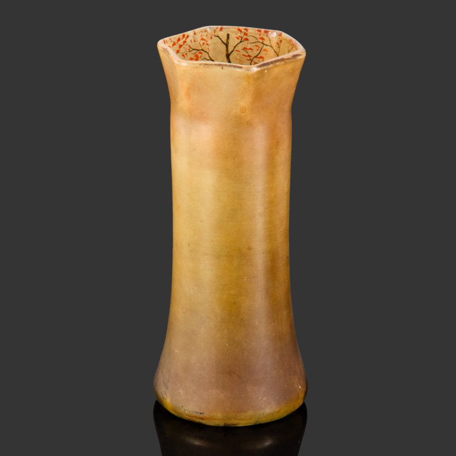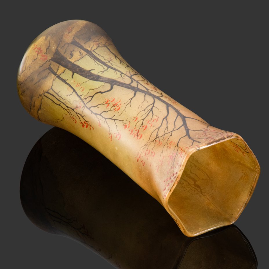 Ваза с шестигранным краем, декорированная изображением осеннего пейзажа (тип формы "Диаболо"), стекло, роспись полихромной эмалью, Франция, 1900-1930 гг.