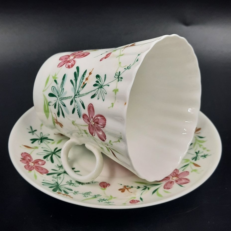 Пара кофейная "Яблоневый цвет", форма "Ветерок" (автор формы Т.С. Линчевская), фарфор, деколь, золочение, Ленинградский фарфоровый завод (ЛФЗ), Россия, 1989-2001 гг.