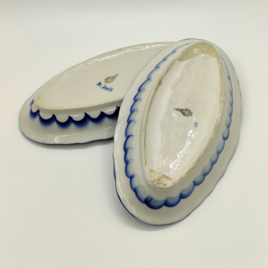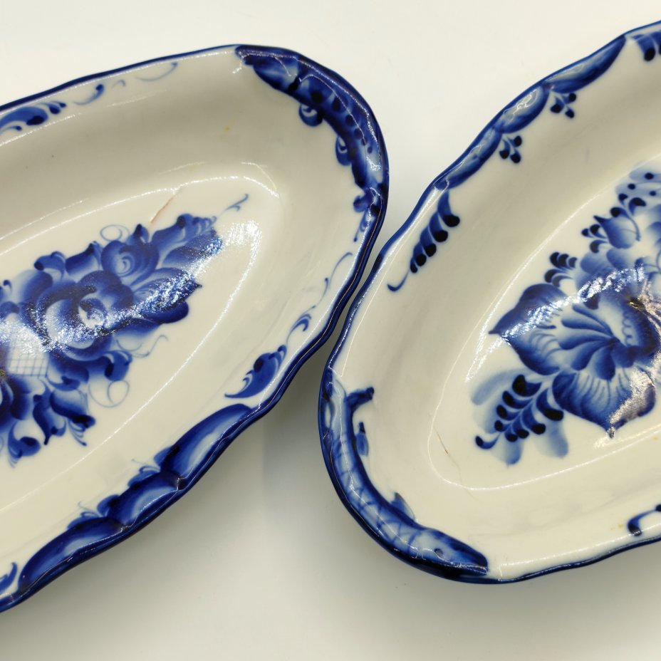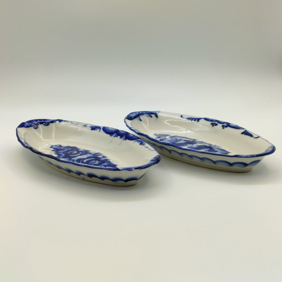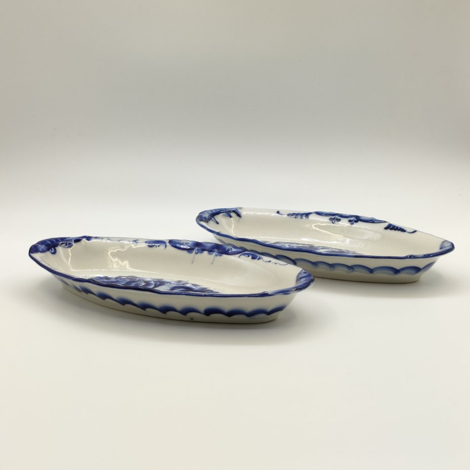 Пара селёдочниц с рельефным декором в виде рыб вдоль борта, фарфор, роспись, Гжельский фарфоровый завод, Российская Федерация, 1991-2015 гг.