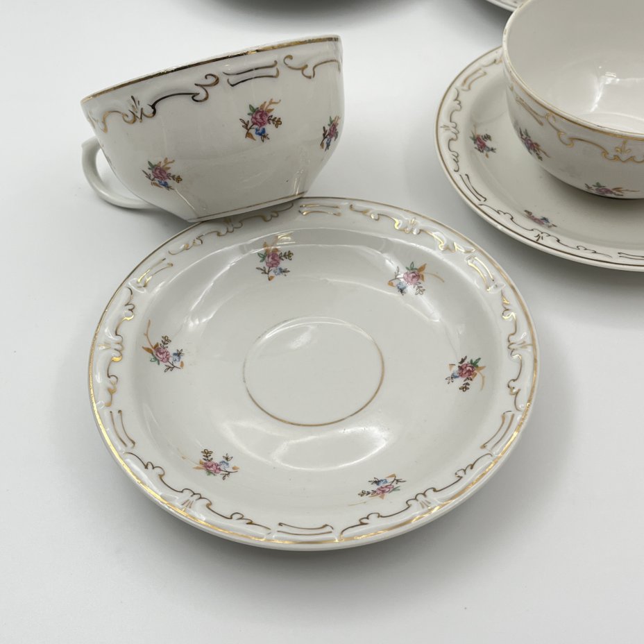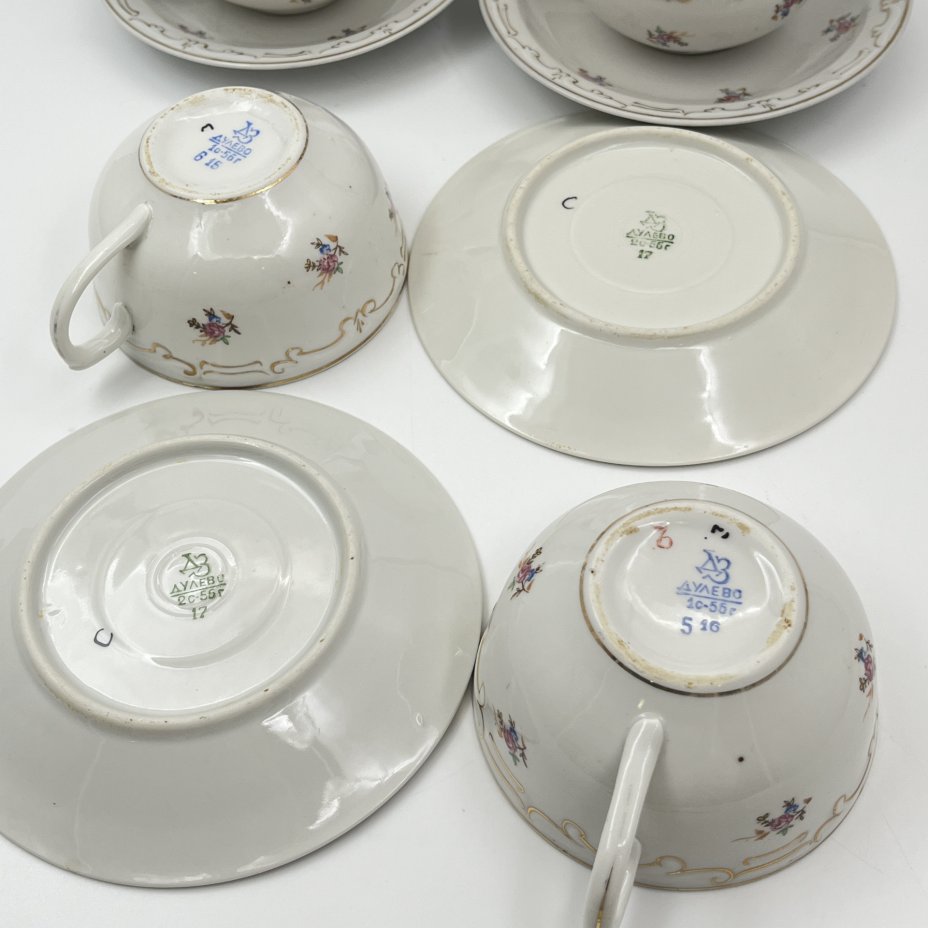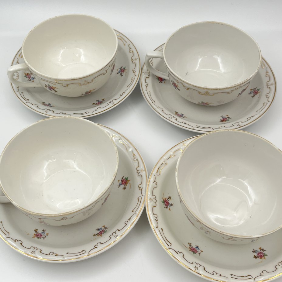 Набор из четырех чайных пар с цветочным декором, фарфор, деколь, золочение, Дулевский фарфоровый завод (Дулёво), СССР, 1956 г.