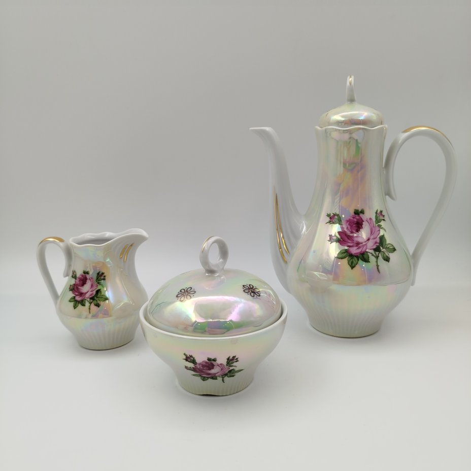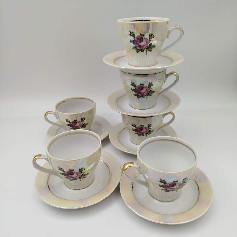 Сервиз чайный с декором в виде роз на 6 персон (28 предметов), фарфор, деколь, люстр, золочение, Colditz (Кольдиц), ГДР, 1970-1990 гг.