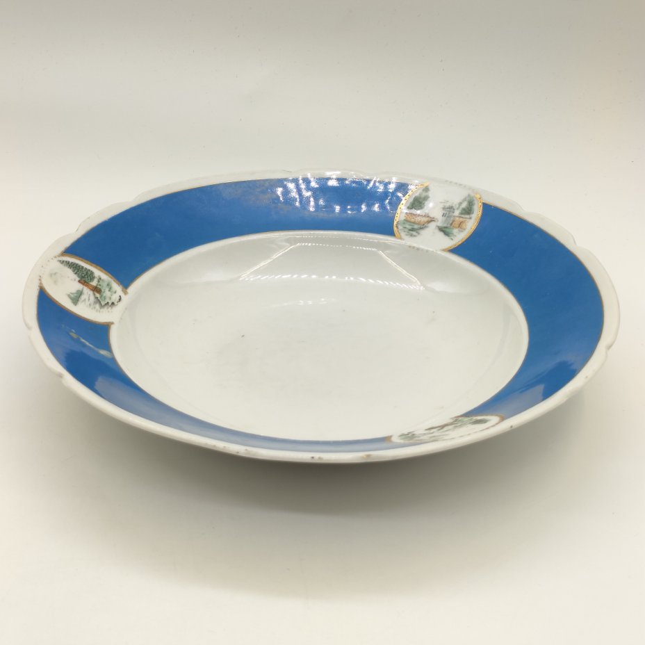 Тарелка суповая из сервиза «Озерный», фарфор, крытье, деколь, золочение, Фарфоровый завод «Пролетарий» (Бронница, Мста), СССР, 1930-1945 гг.