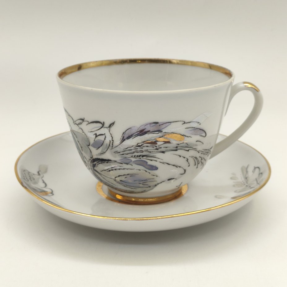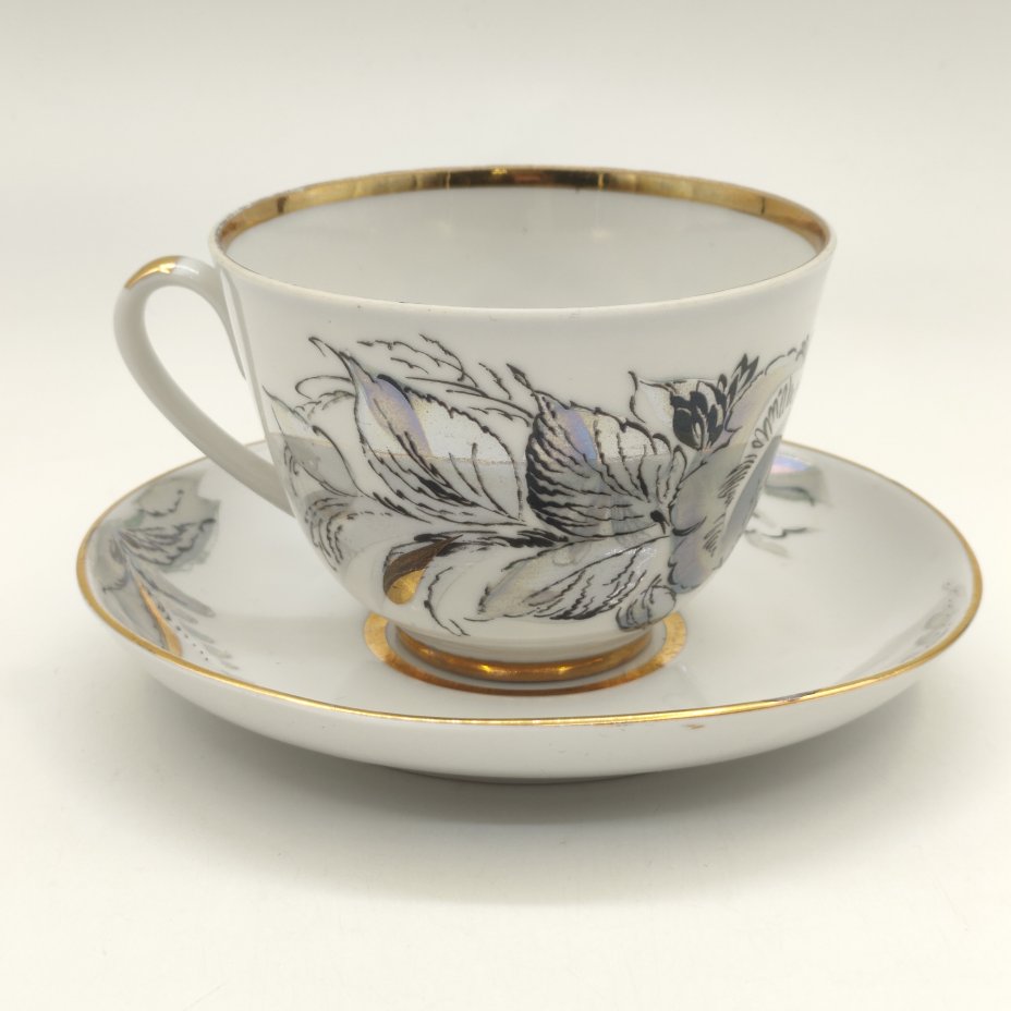 Чайная пара из сервиза "Жемчужный", автор формы "Весенняя" Яковлева С.Е., автор рисунка Семенова А.Н., фарфор, деколь, люстр, золочение, Ленинградский фарфоровый завод (ЛФЗ), СССР, 1970-1991 гг.