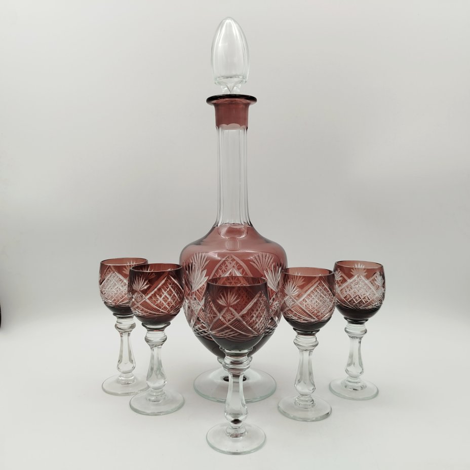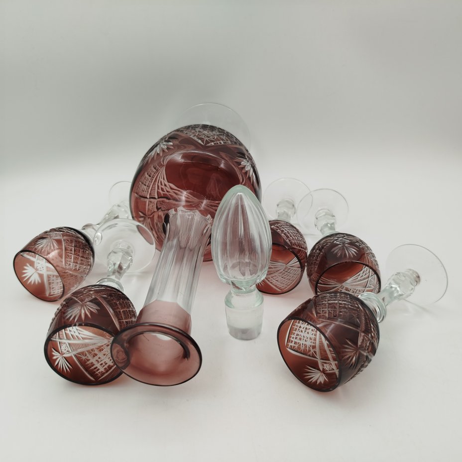 Набор из штофа и 6 стопок, стекло, гутная техника, Львовская керамико-скульптурная фабрика (ЛКСФ), СССР, 1960-1980 гг.