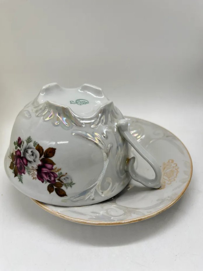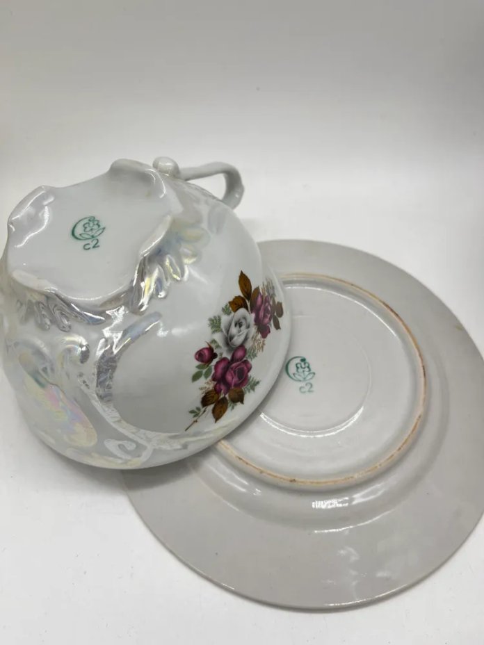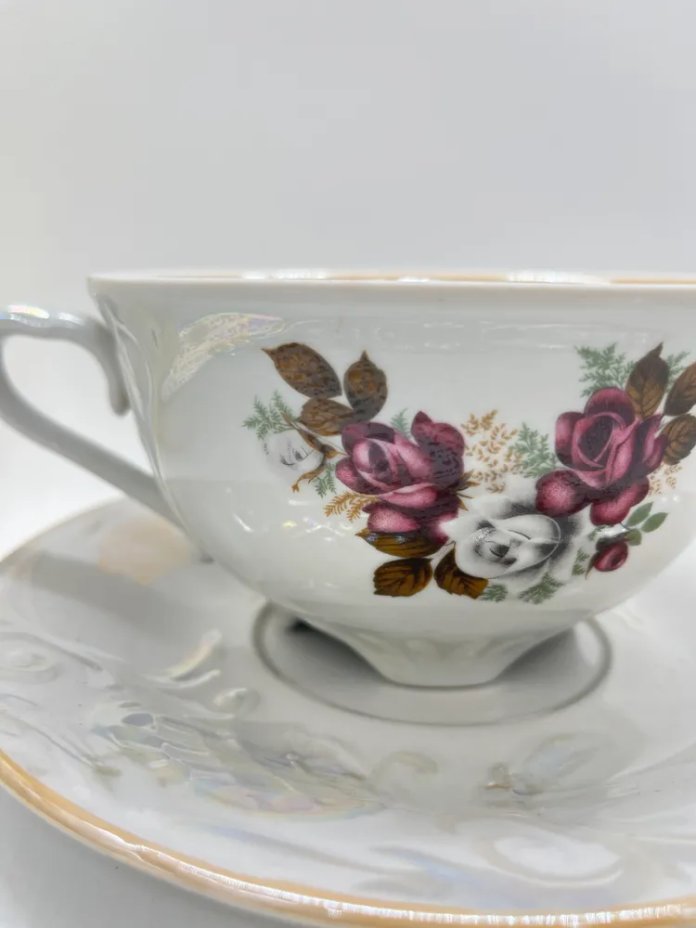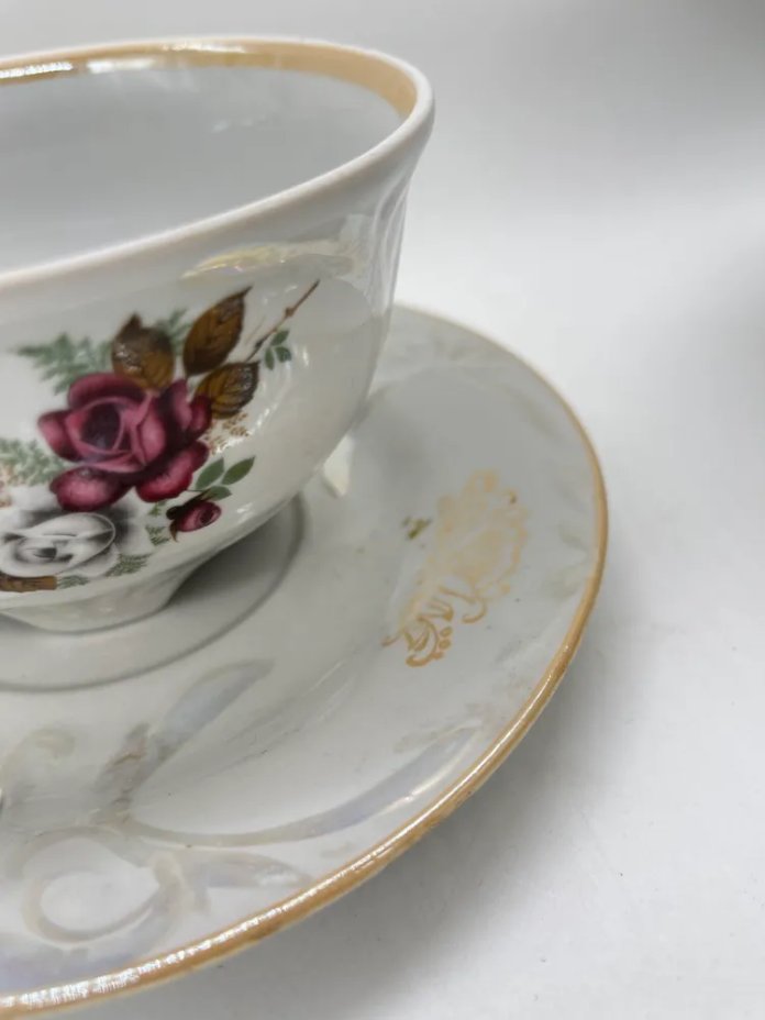 Чайная пара большая с цветочным декором, фарфор, люстр, деколь, Сумский фарфоровый завод, СССР, 1980 г.