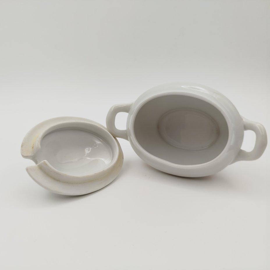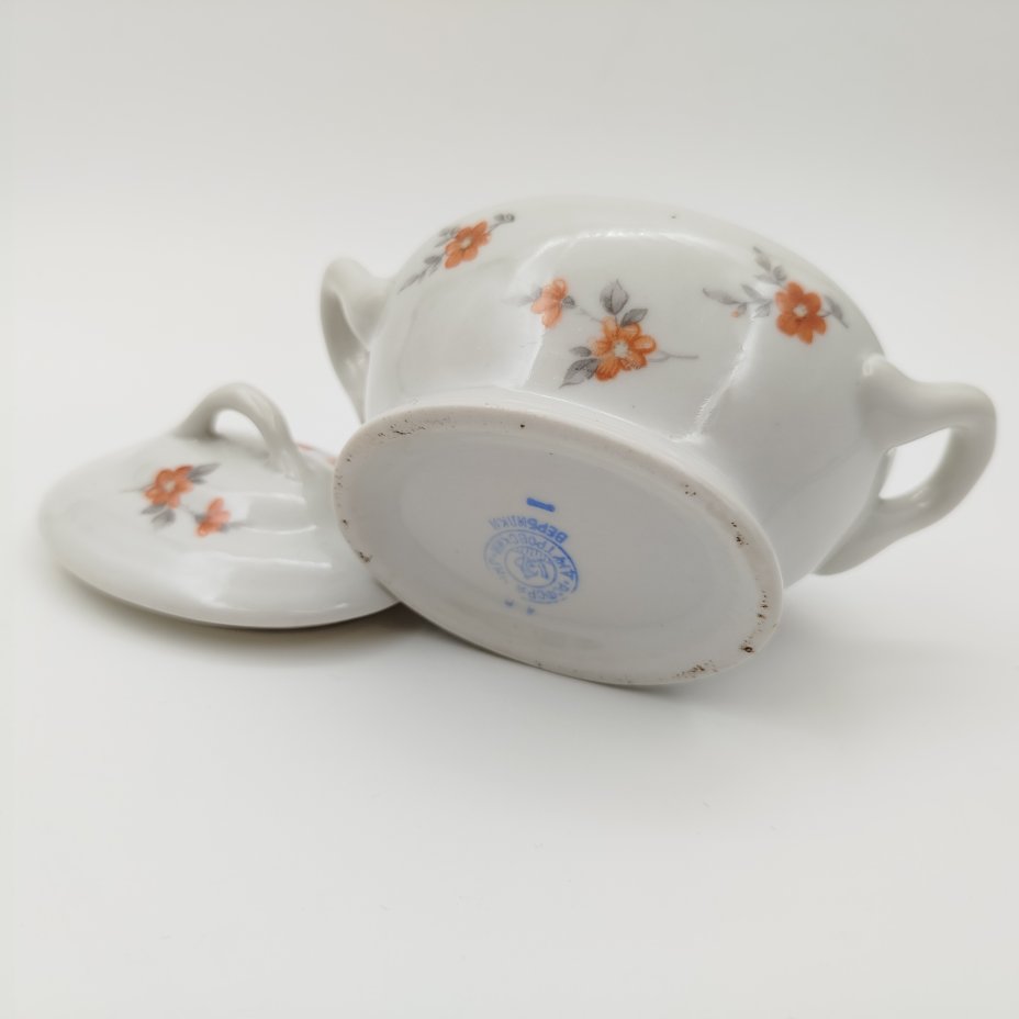 Сахарница со стилизованным декором в виде птиц на ветках, фарфор, деколь, золочение, Дмитровский фарфоровый завод (ДФЗ Вербилки), СССР, 1965-1991 гг.