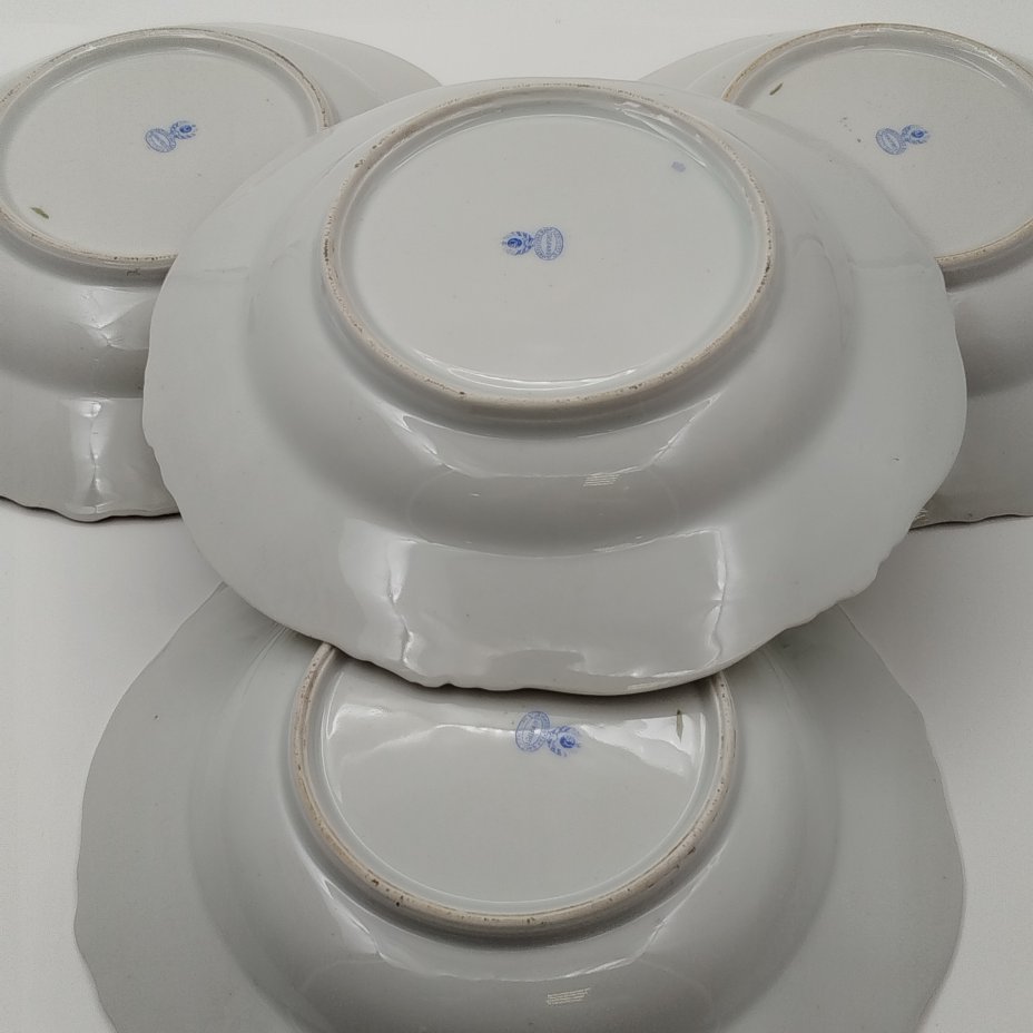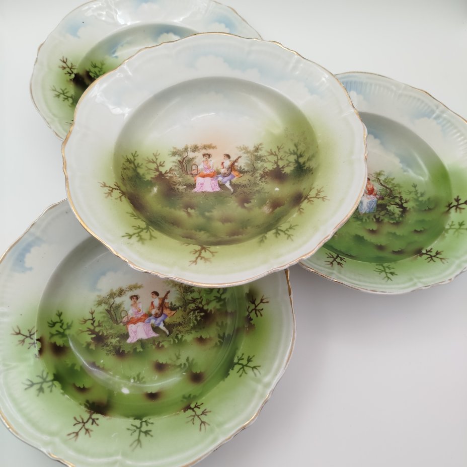 Набор суповых тарелок "Галантная сцена" на 4 персоны, фарфор, деколь, крытье, золочение, Дмитровский фарфоровый завод (ДФЗ Вербилки), СССР, 1924-1927 гг.