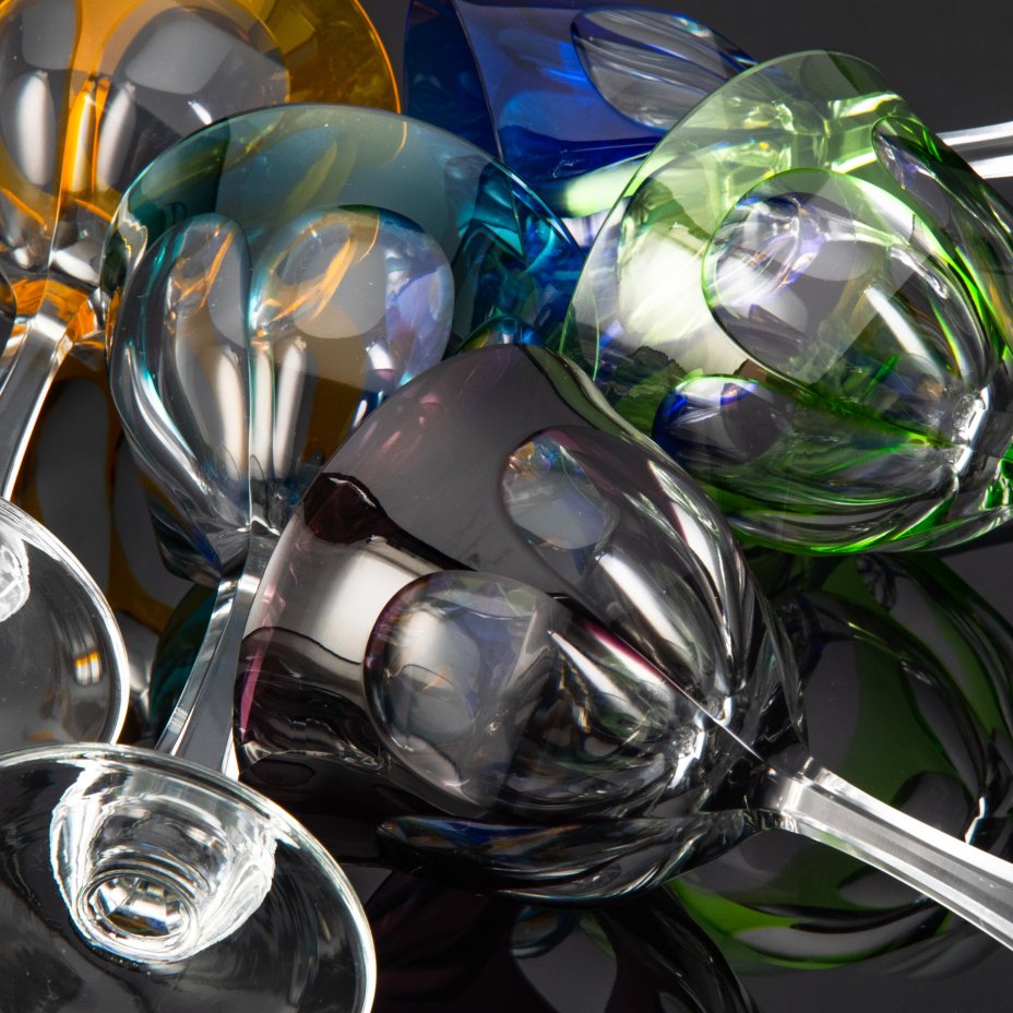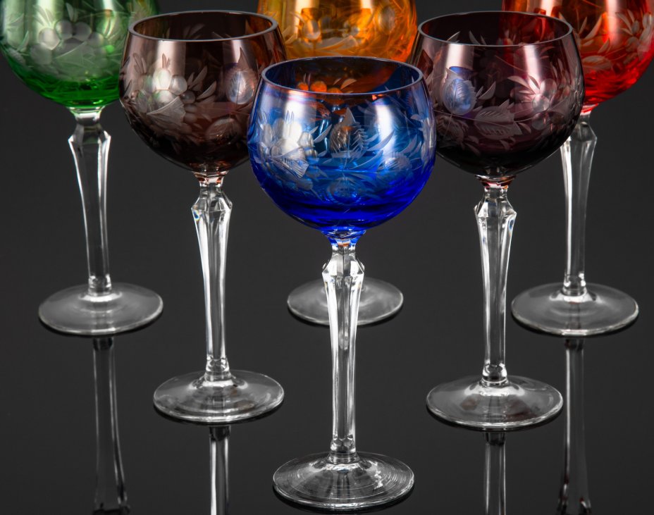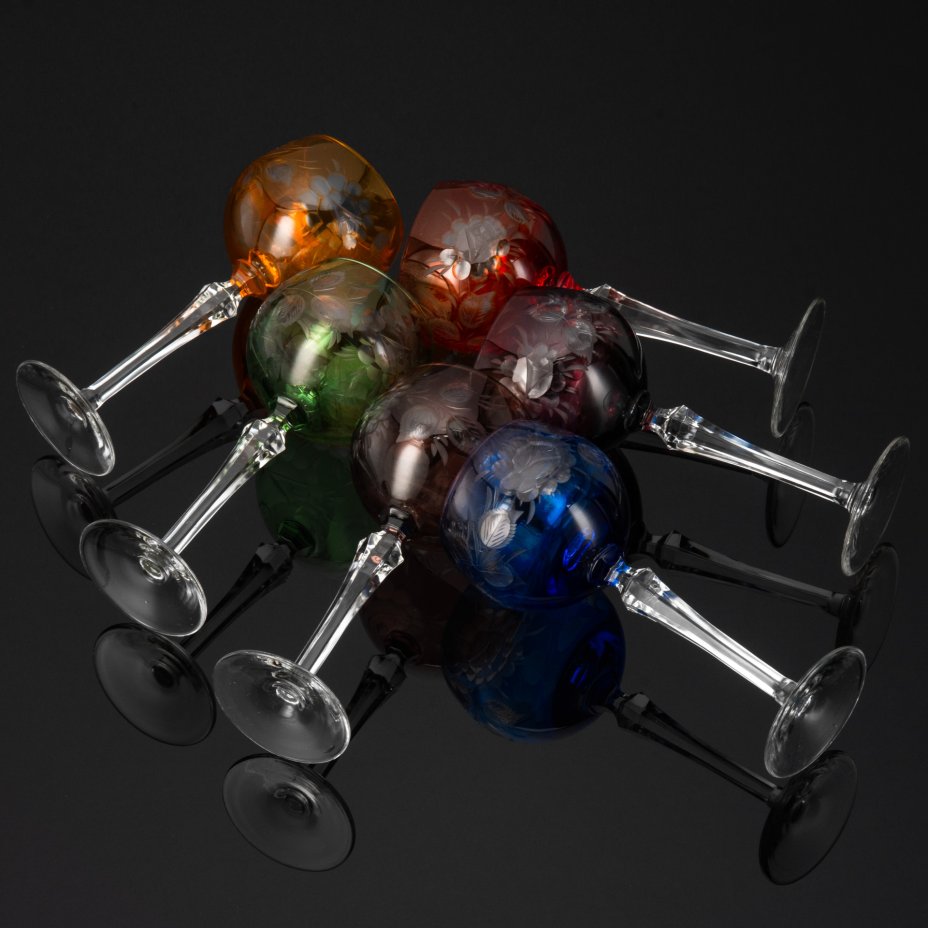 Набор из 6-ти бокалов разного оттенка, украшенных цветочным декором, стекло, нацвет, резьба, Западная Европа, 1950-1970 гг.