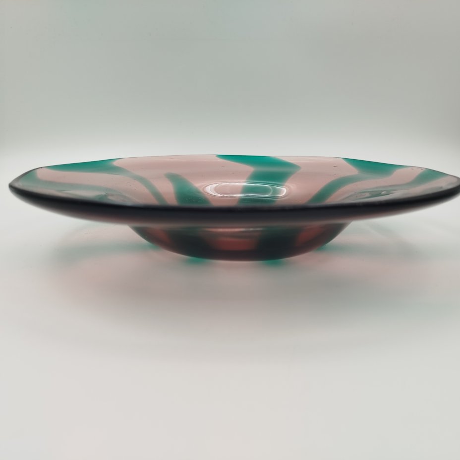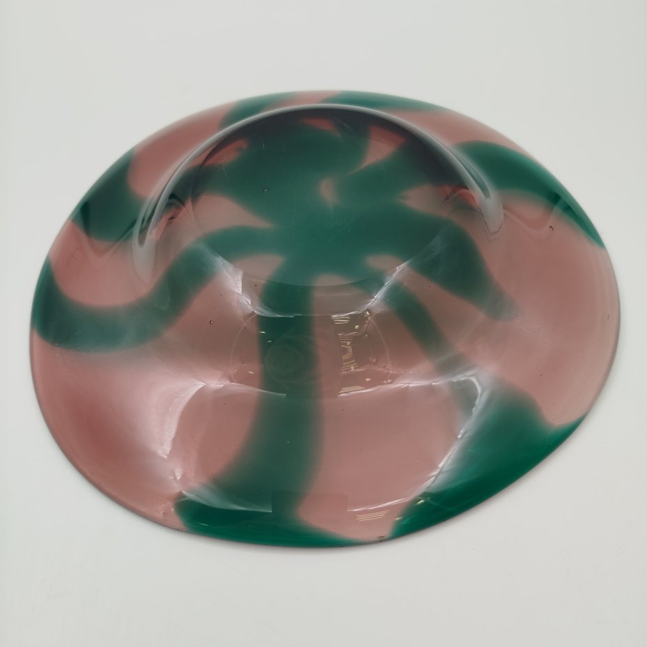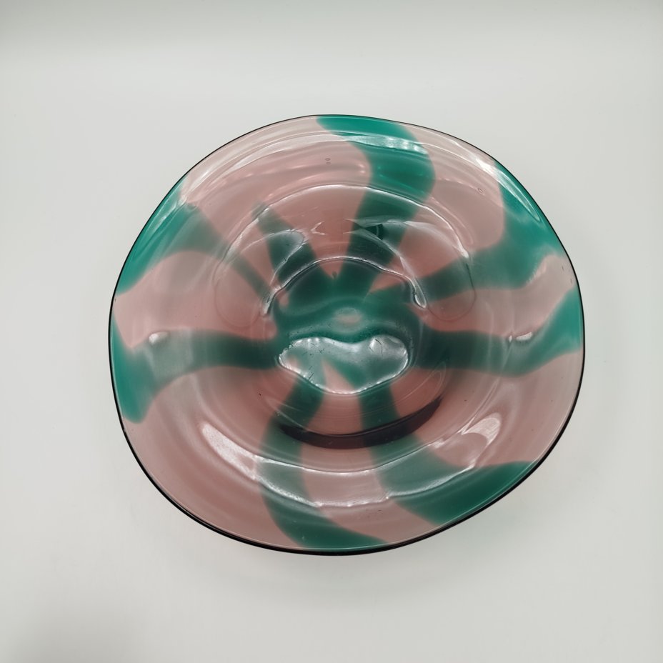 Блюдо неправильной круглой формы, марганцево-зеленого оттенка, стекло, СССР, 1960-1990 гг.