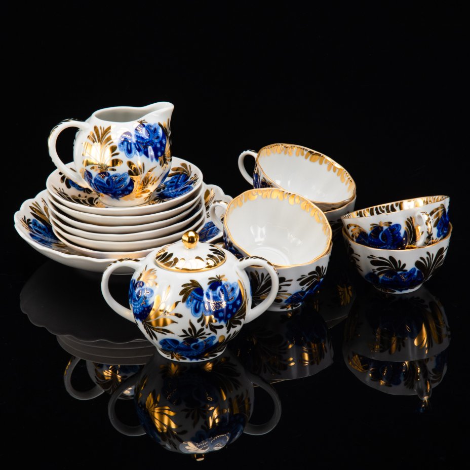 Сервиз чайный "Золотой сад" на 6 персон (15 предметов), автор формы "Тюльпан" С.Е. Яковлева, автор рисунка Н.П. Славина, фарфор, деколь, роспись золотом, золочение, Ленинградский фарфоровый завод (ЛФЗ), СССР, 1972-1991 гг.