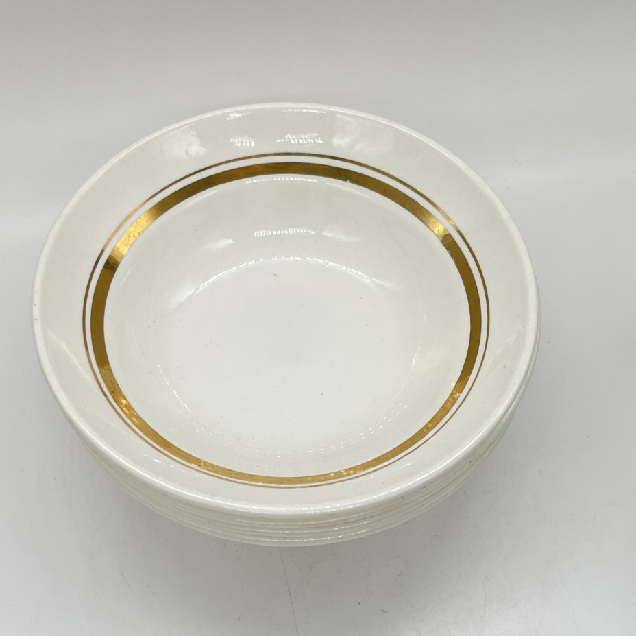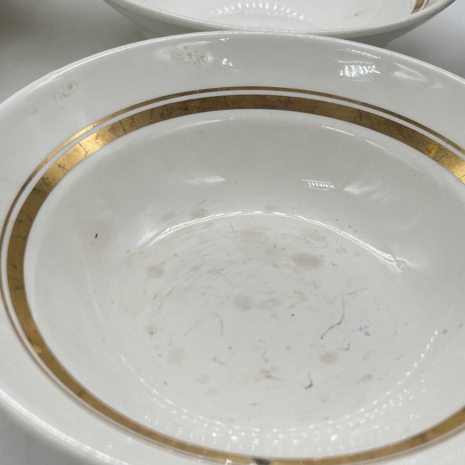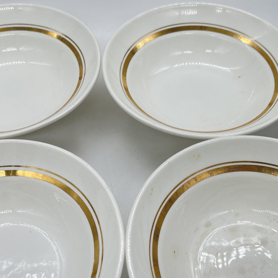 Набор из 4 суповых тарелок с декором в виде золотых полос, фаянс, золочение, Конаковский фаянсовый завод им. М.И. Калинина (ЗиК Конаково), СССР, 1960-1990 гг.