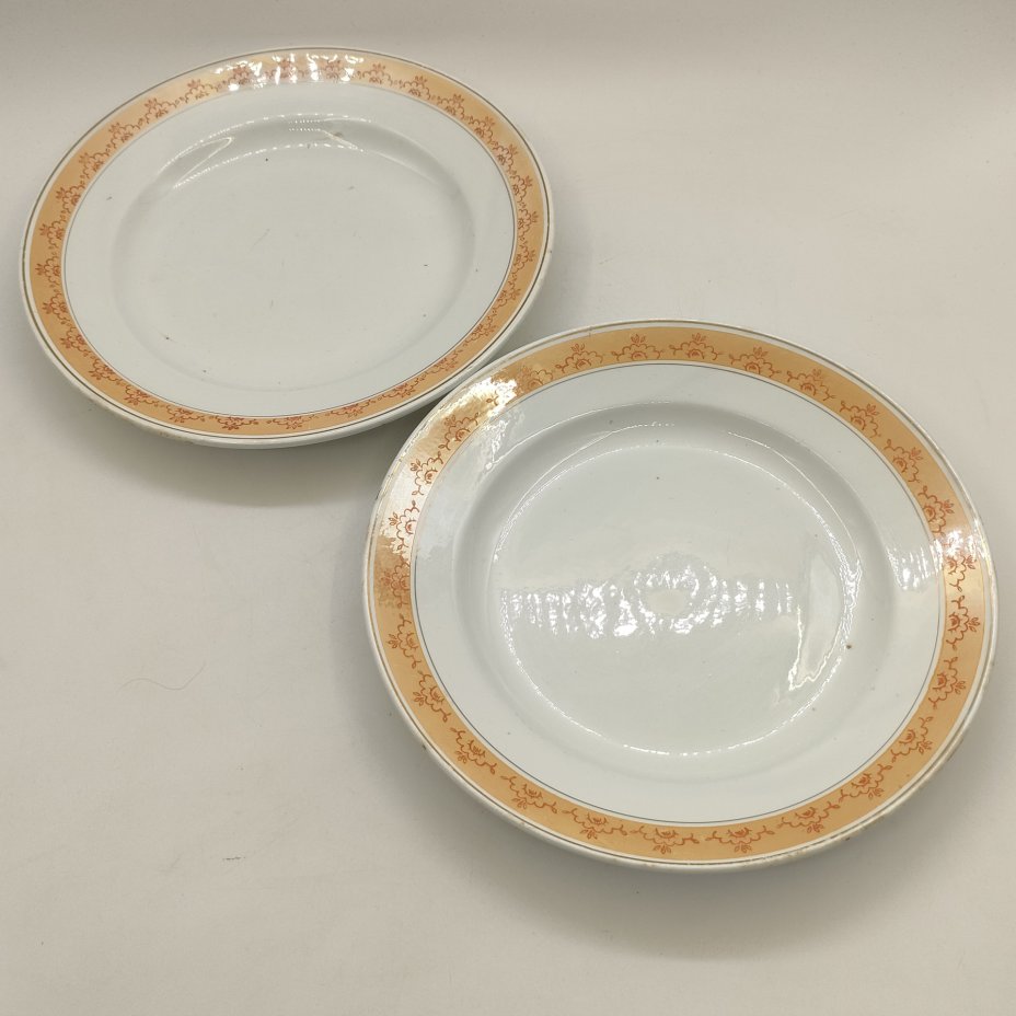 Пара обеденных тарелок, украшенных цветочным орнаментом по канту, фаянс, золочение, деколь, Конаковский фаянсовый завод им. М.И. Калинина (ЗиК Конаково), СССР, 1932-1952 гг.