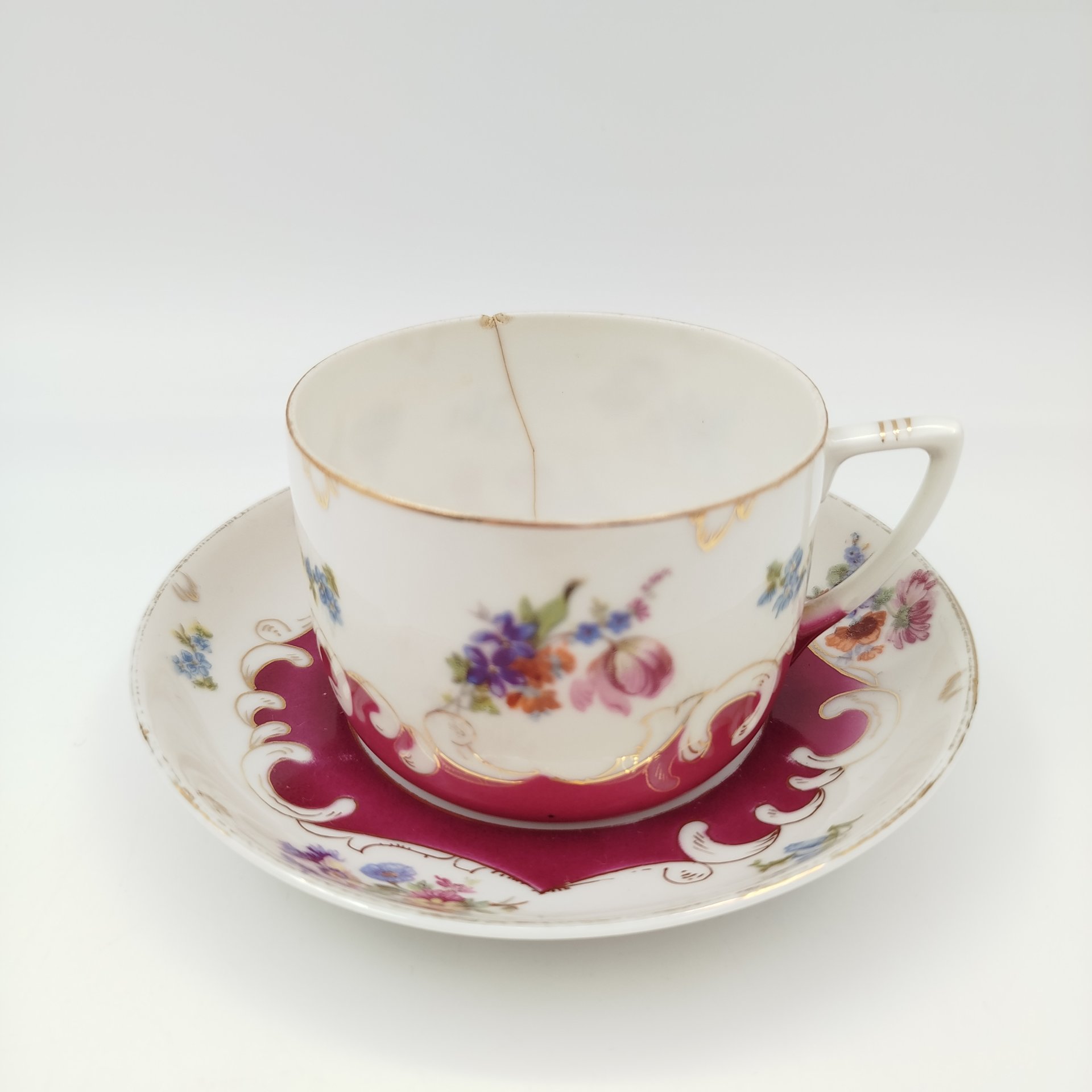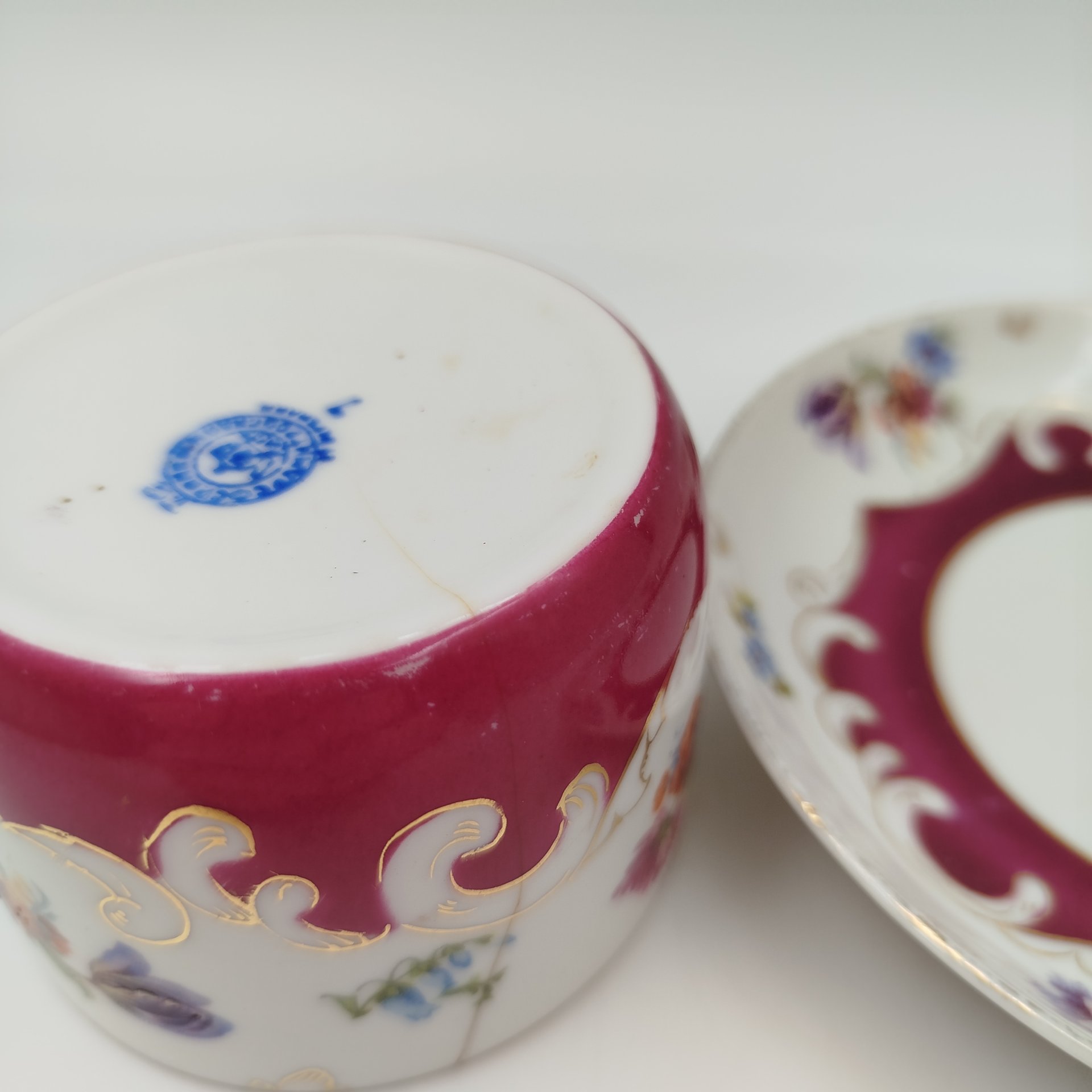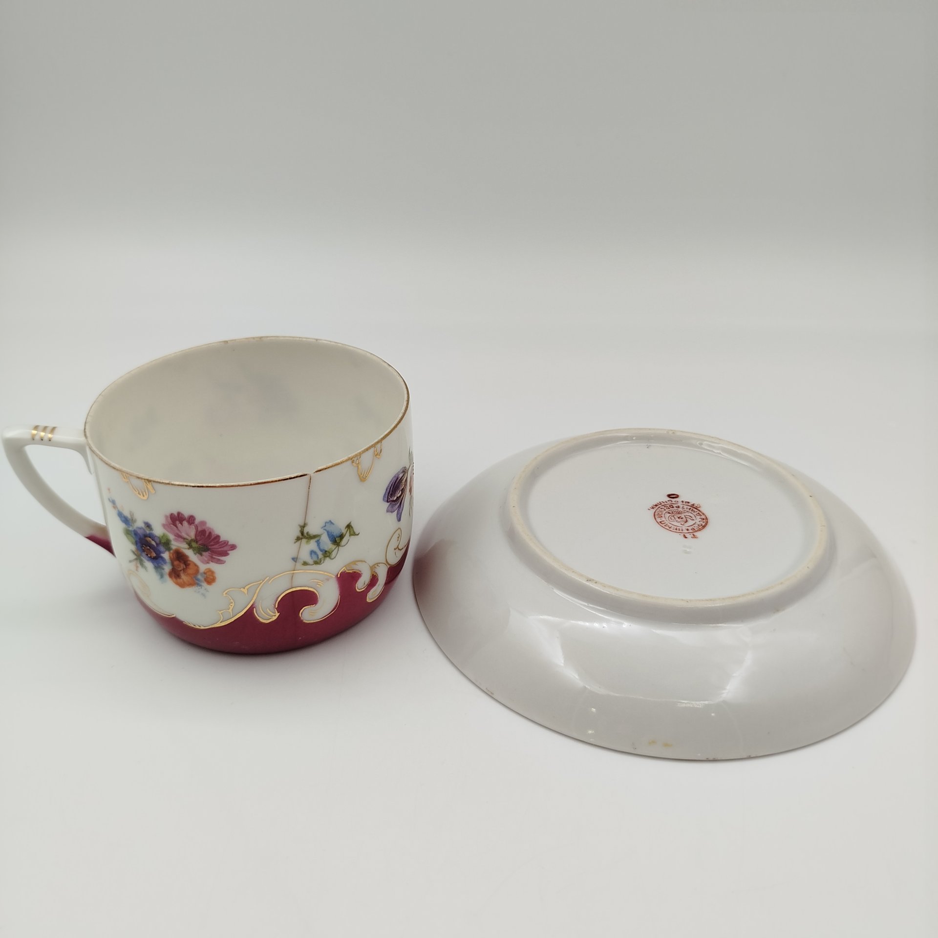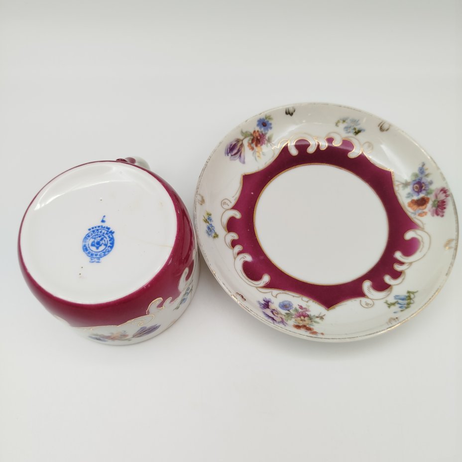 Пара чайная с цветочным декором, фарфор, печать по трафарету, обводка, золочение, Дмитровский фарфоровый завод (ДФЗ Вербилки), СССР, 1946-1950 гг.