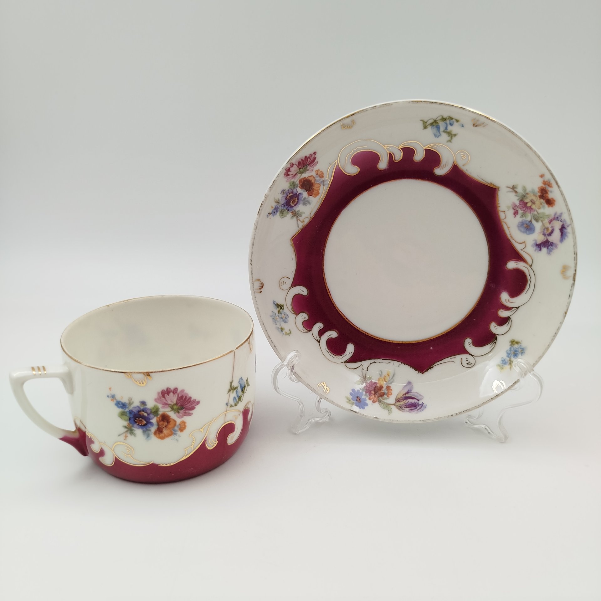 Чайная пара большая с цветочным декором, фарфор, люстр, деколь, Сумский фарфоровый завод, СССР, 1980 г.