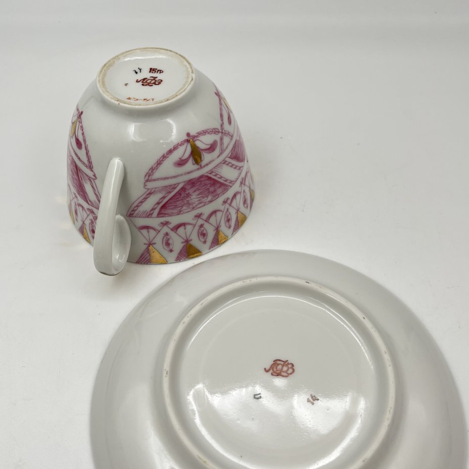 Пара чайная с цветочным декором, фарфор, печать по трафарету, обводка, золочение, Дмитровский фарфоровый завод (ДФЗ Вербилки), СССР, 1946-1950 гг.
