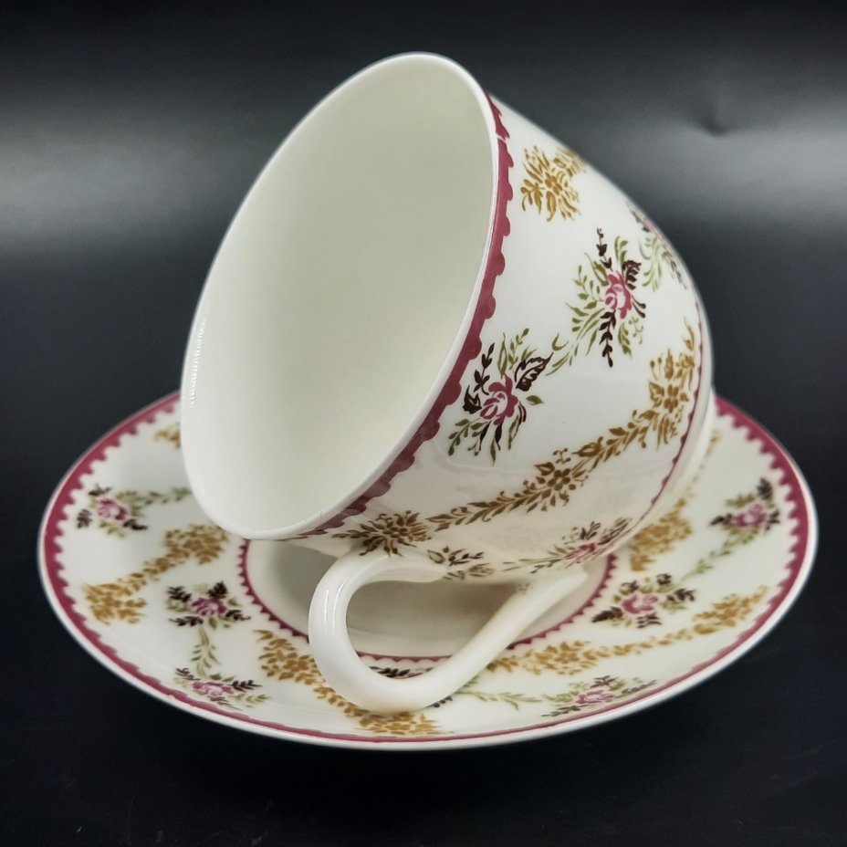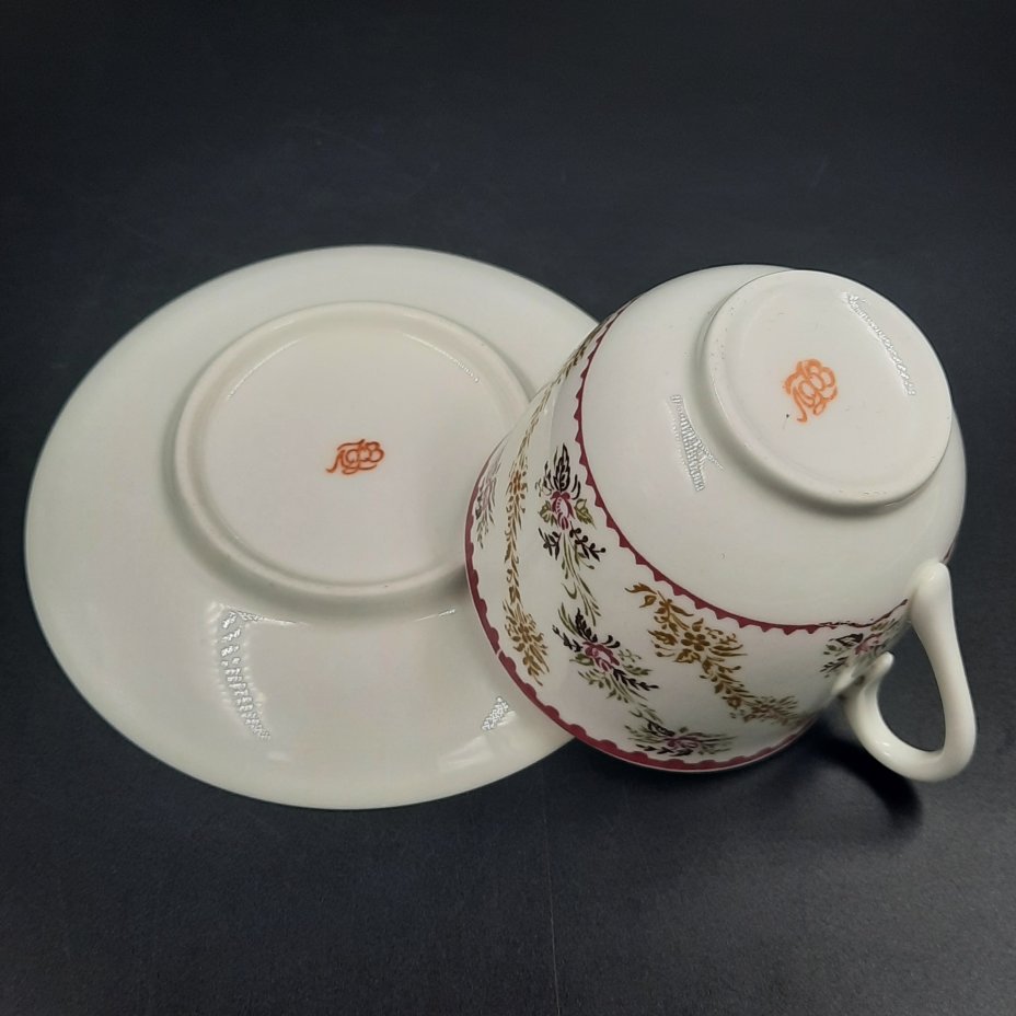 Пара кофейная с декором в виде цветочных гирлянд, форма "Майская", автор формы Э.М. Криммер, фарфор, деколь, золочение, Ленинградский фарфоровый завод (ЛФЗ), СССР, 1970-1992 гг.
