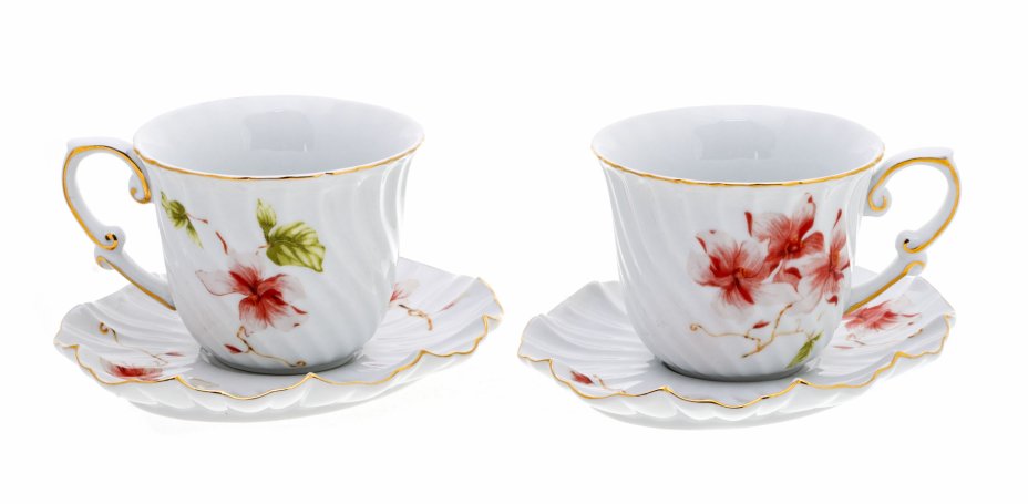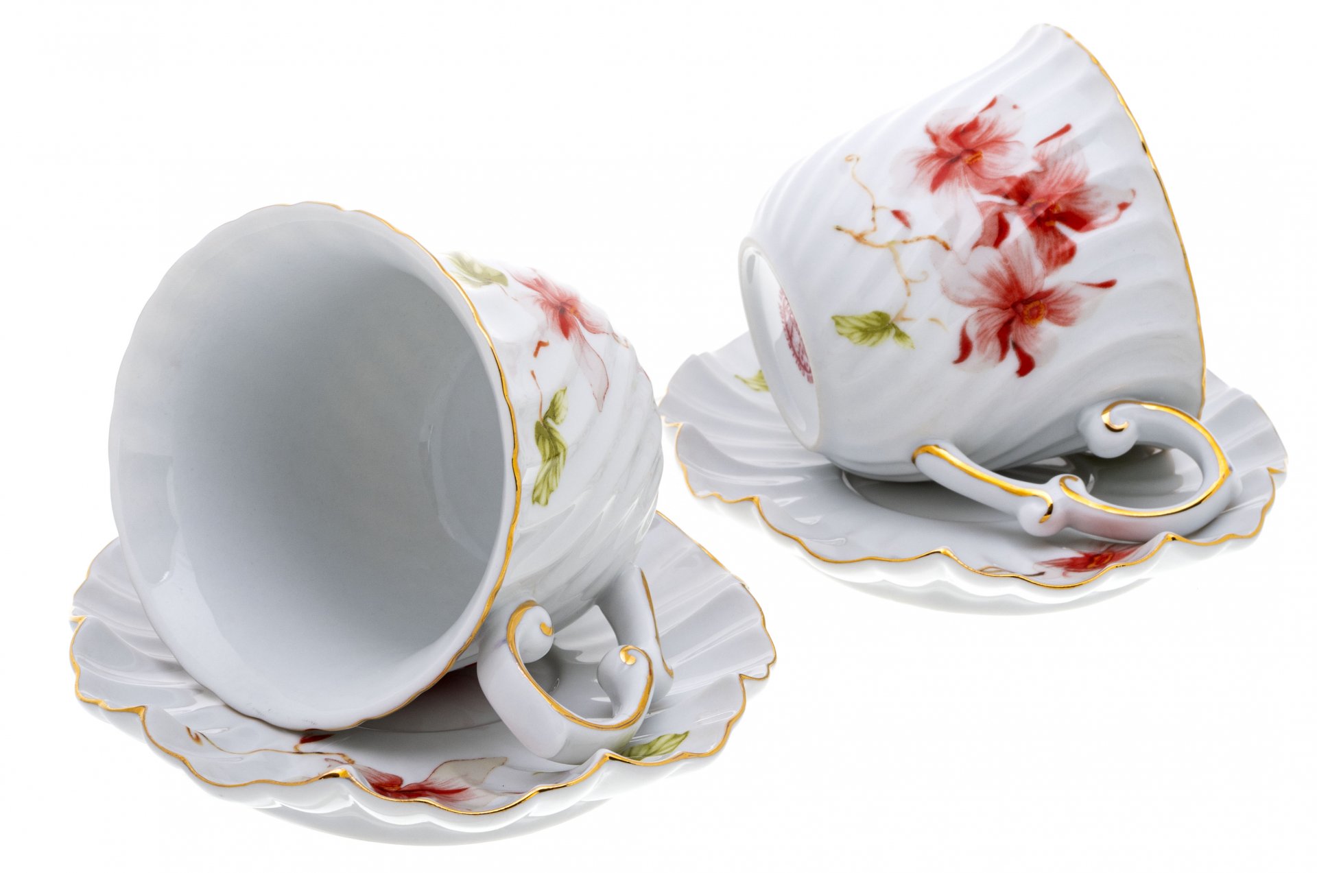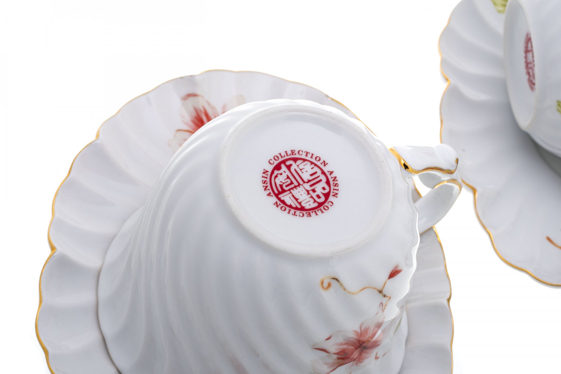 Набор чайных пар необычной формы с цветочным декором, на две персоны, фарфор, печать, золочение, "Ansin", Китай, 2000-2020 гг.