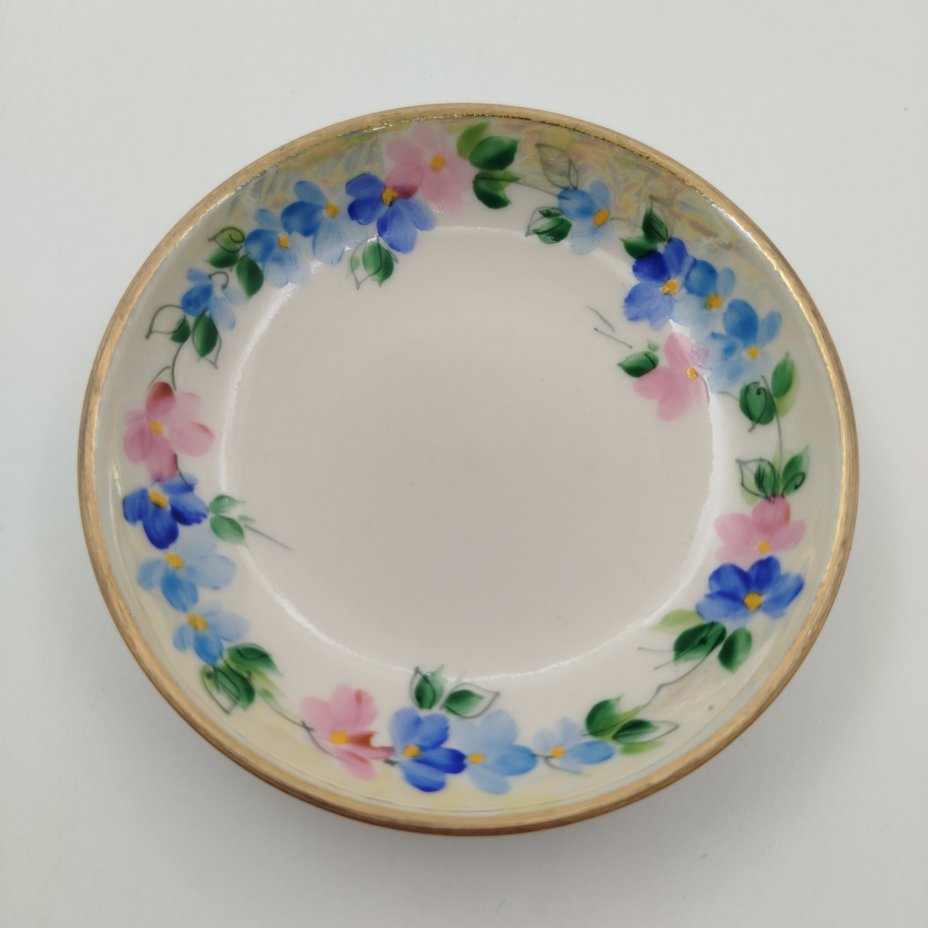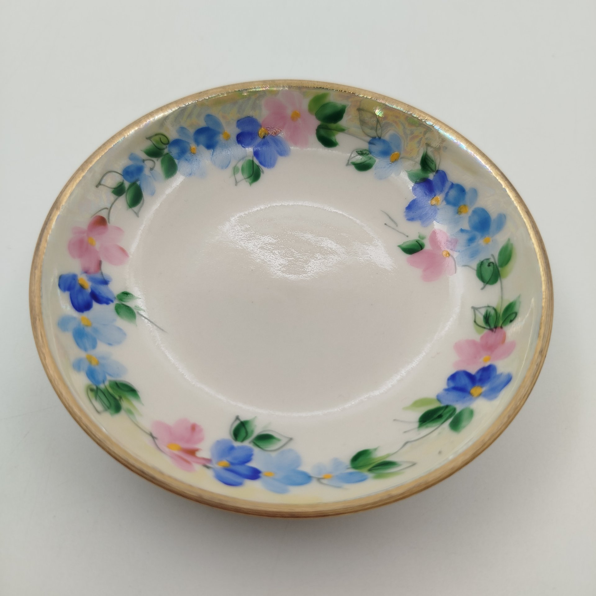 Пара розеток (блюдец) с цветочным декором, фаянс, деколь, обводка, Конаковский фаянсовый завод им. М.И. Калинина (ЗиК Конаково), СССР, 1934-1940 гг.