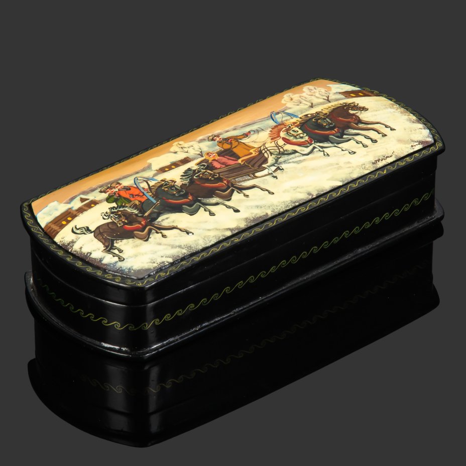 Шкатулка с лаковой миниатюрой "Тройки", автор Котов (?), папье-маше, темпера, лаки, 2010-2015 гг.
