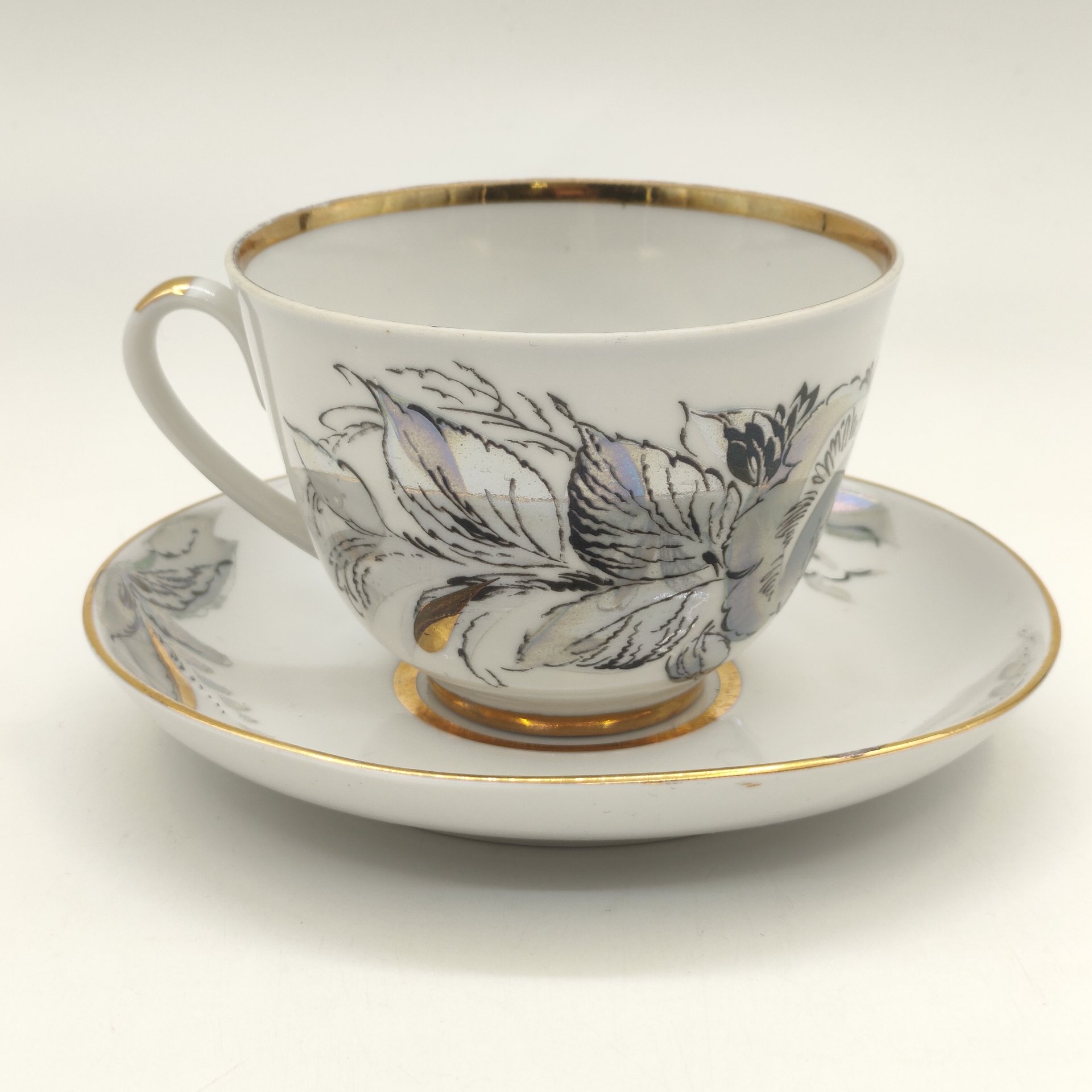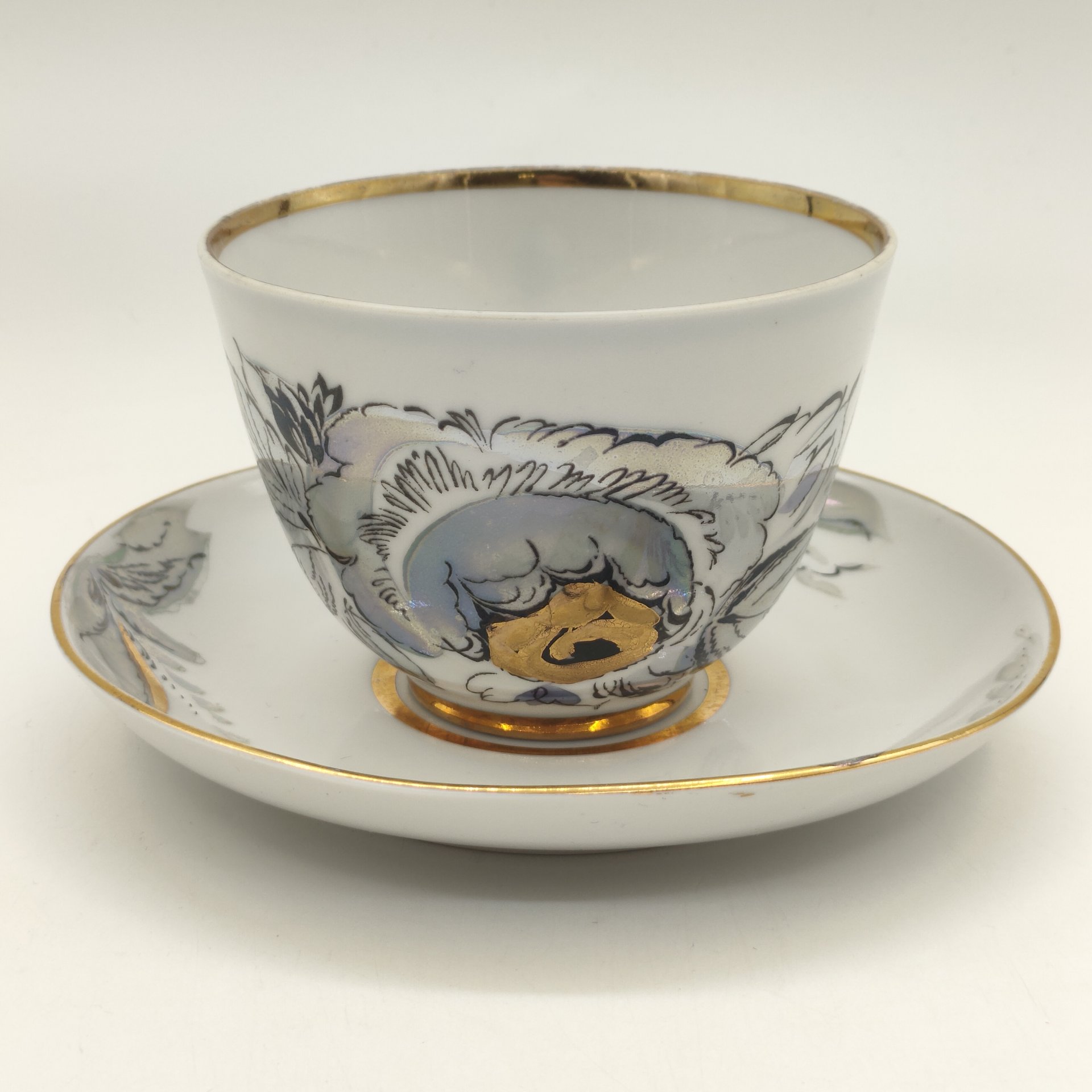 Чайная пара большая с цветочным декором, фарфор, люстр, деколь, Сумский фарфоровый завод, СССР, 1980 г.