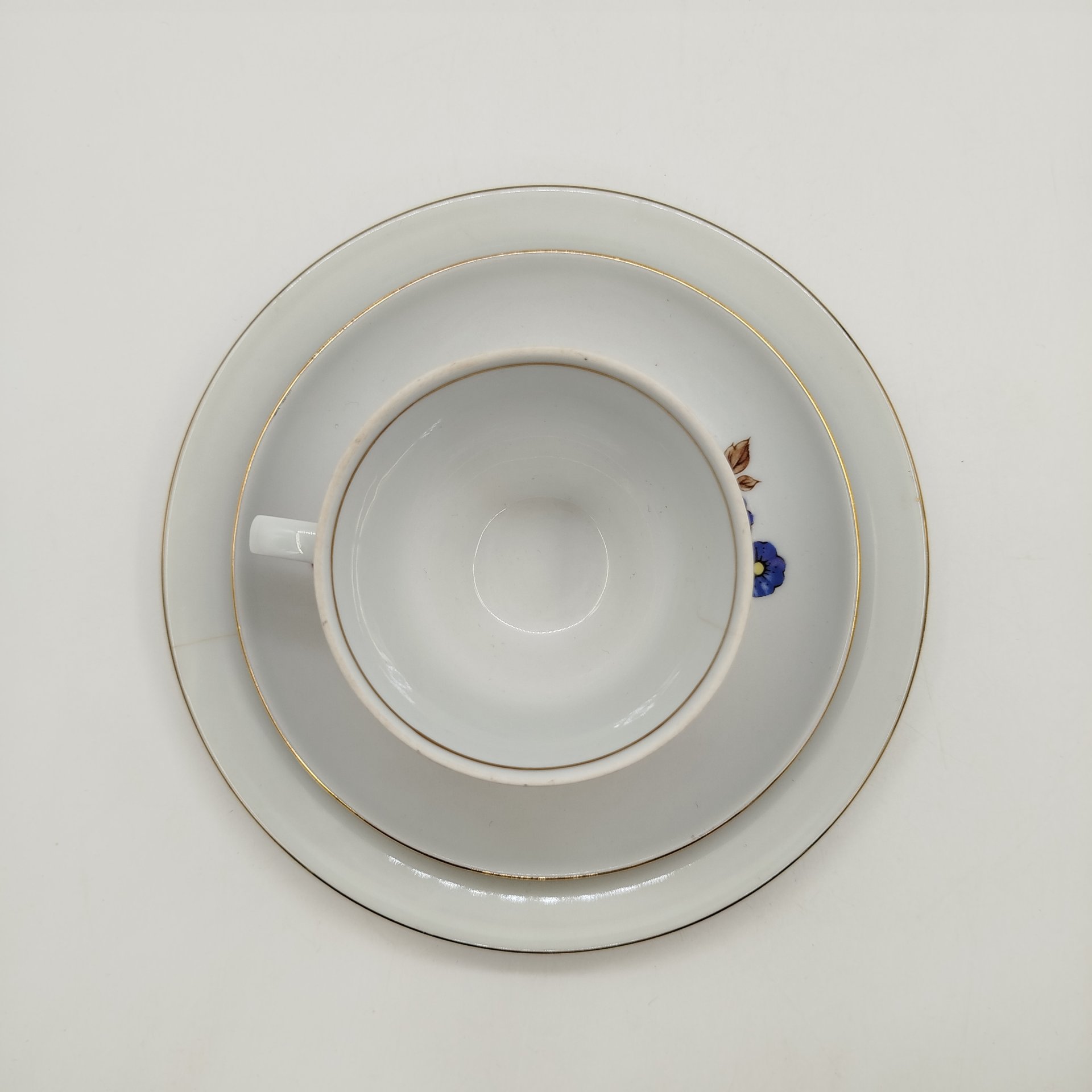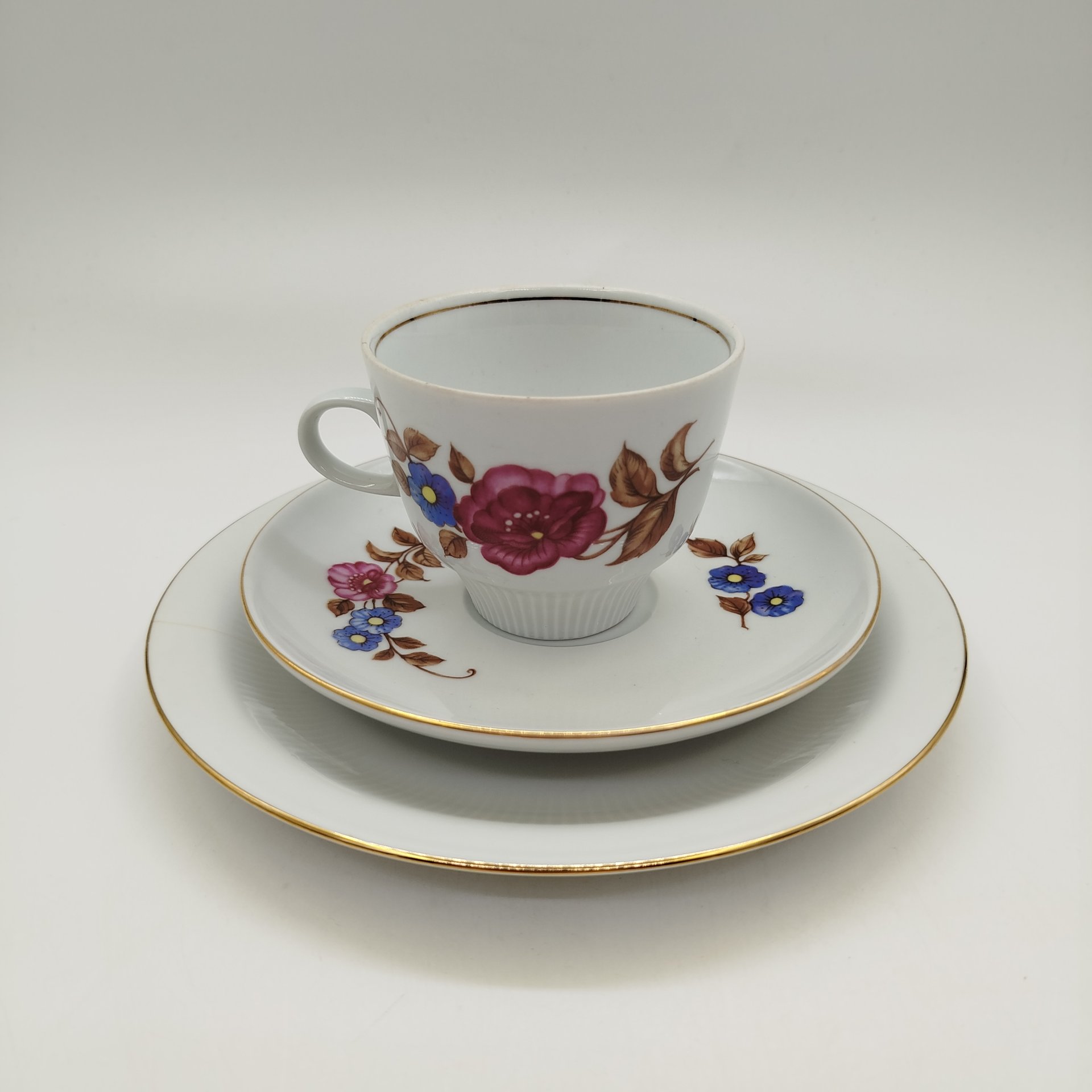 Купить Трио чайное с цветочным декором пурпурного оттенка, фарфор, роспись, золочение, Weimar Porzellan (Веймарский фарфор), ГДР, 1949-1980 гг.