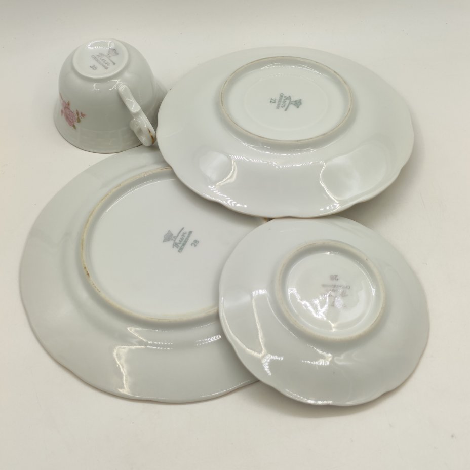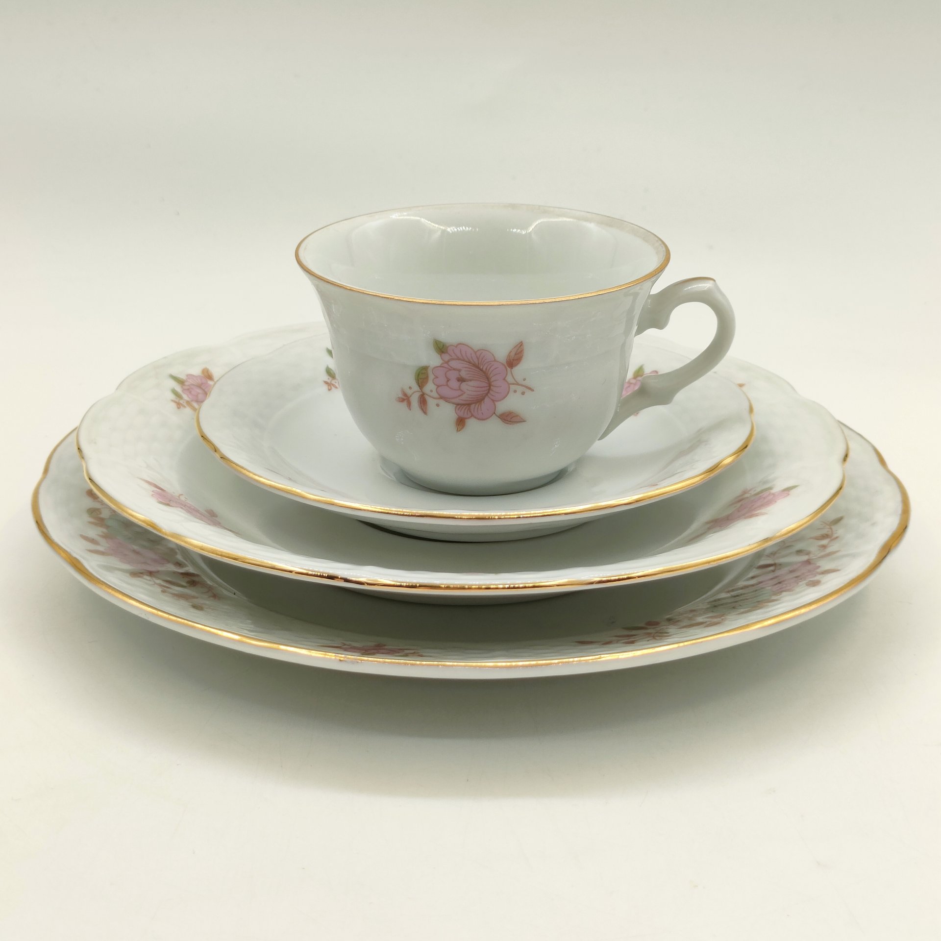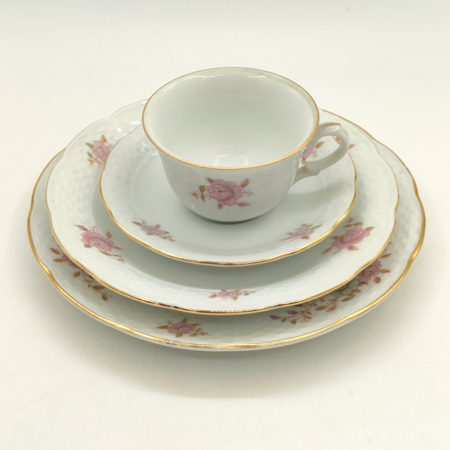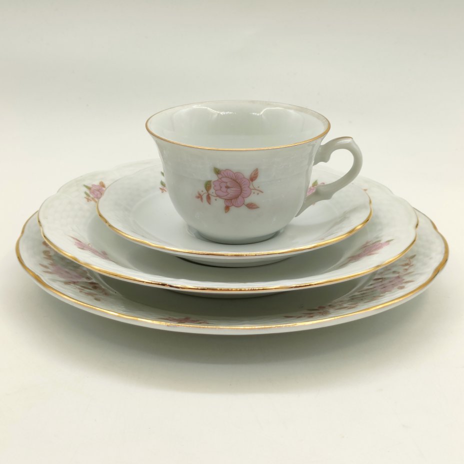 Трио чайное с цветочным декором пурпурного оттенка, фарфор, роспись, золочение, Weimar Porzellan (Веймарский фарфор), ГДР, 1949-1980 гг.