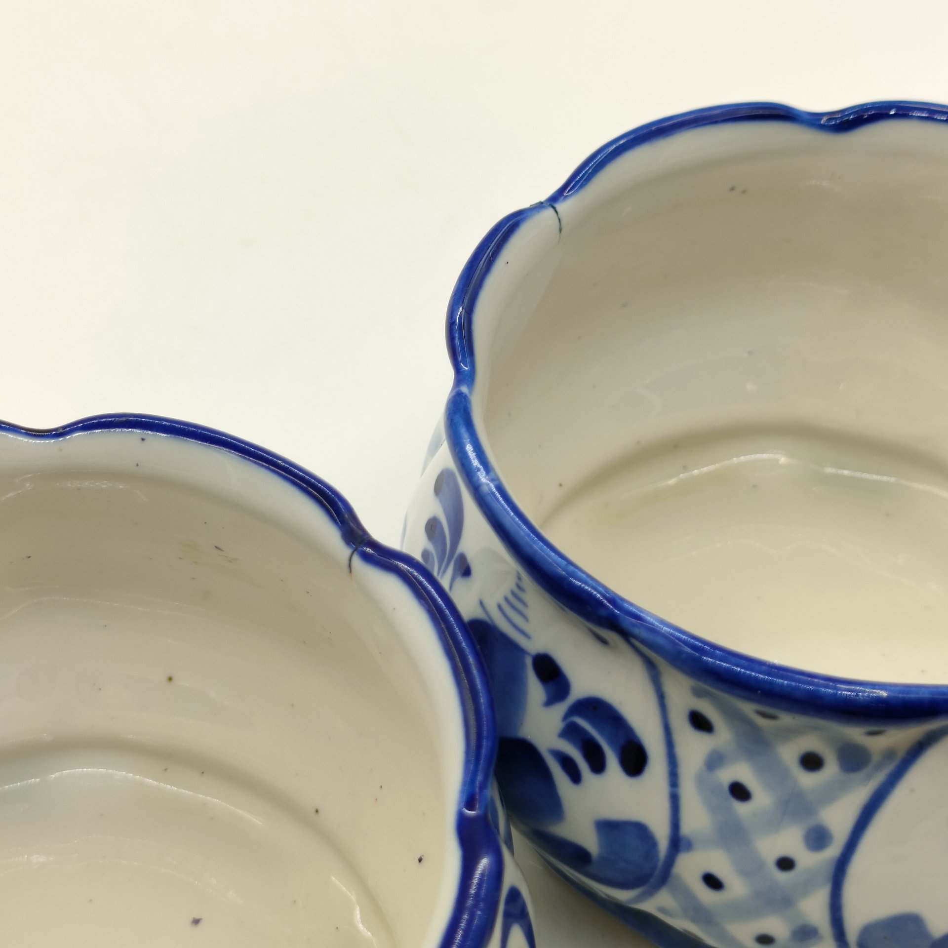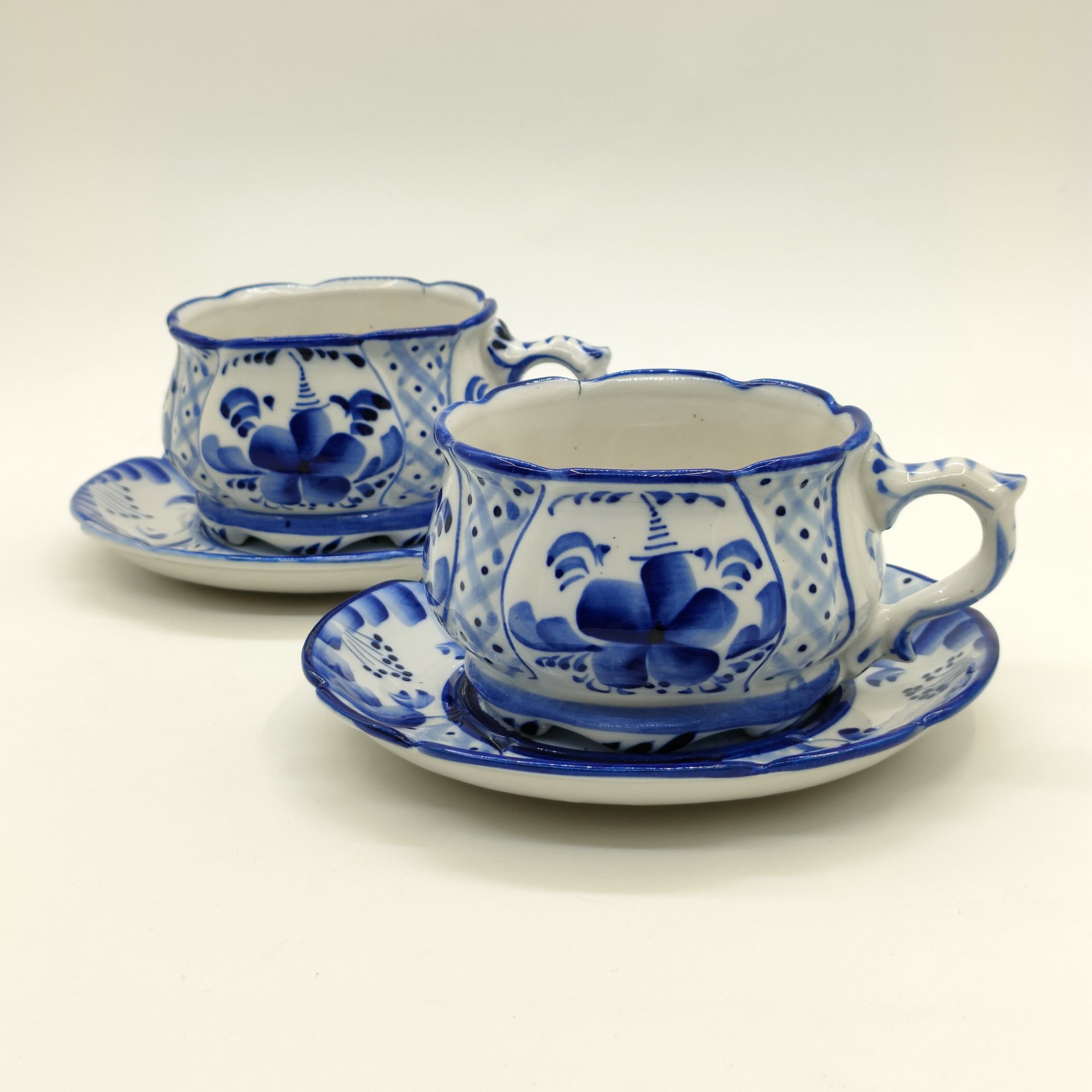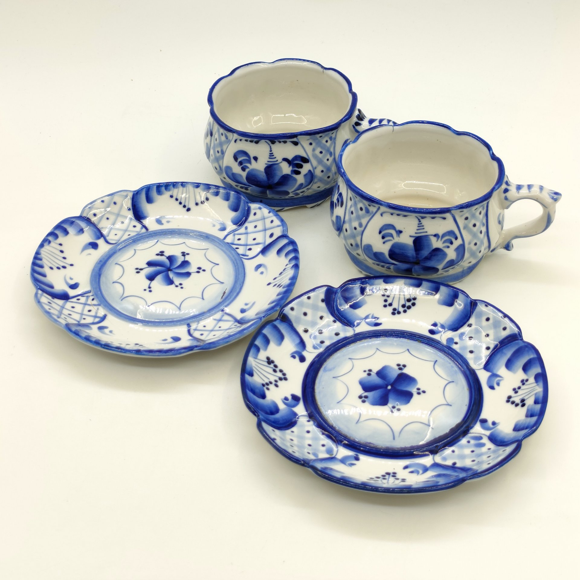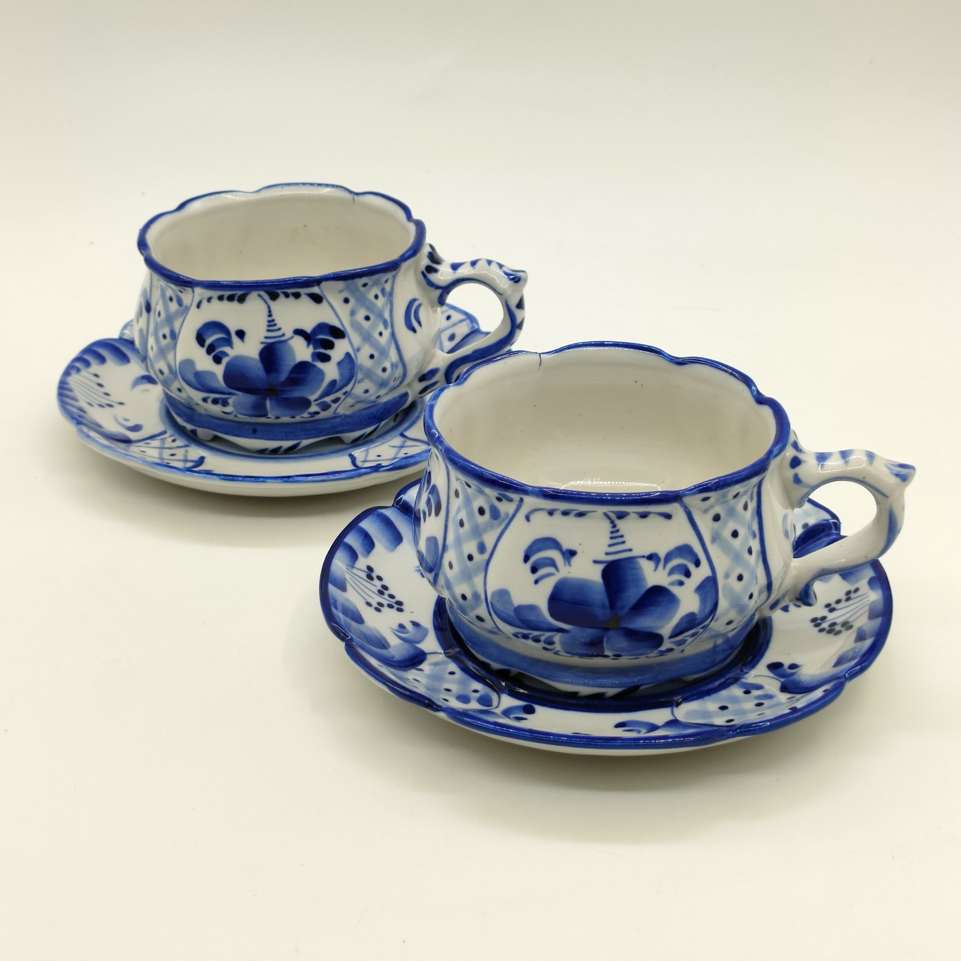 Набор из 2-х чайных пар с цветочным декором, росп. Стрелкова, Гжель, фарфор, роспись, Российская Федерация, 1990-2010 гг.