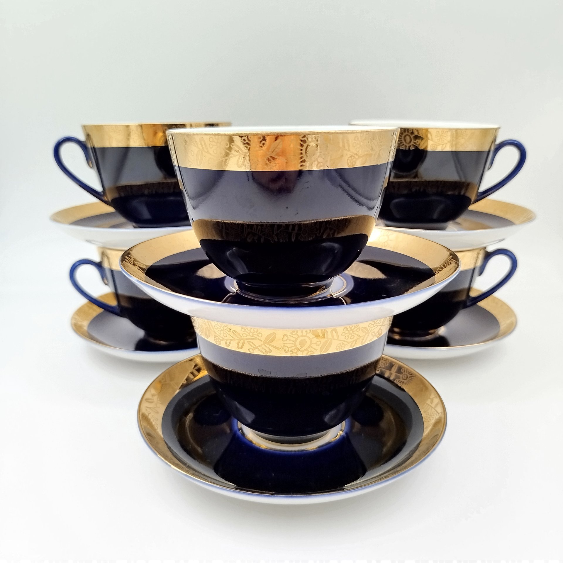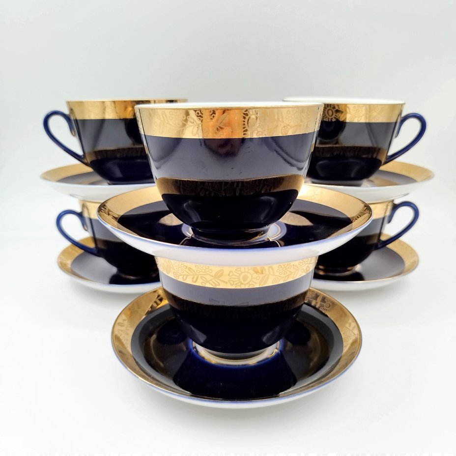 Набор из 6-ти чайных пар, украшенных растительным орнаментом, фарфор, крытье, золочение, Ленинградский фарфоровый завод (ЛФЗ), СССР, 1970-1989 гг.