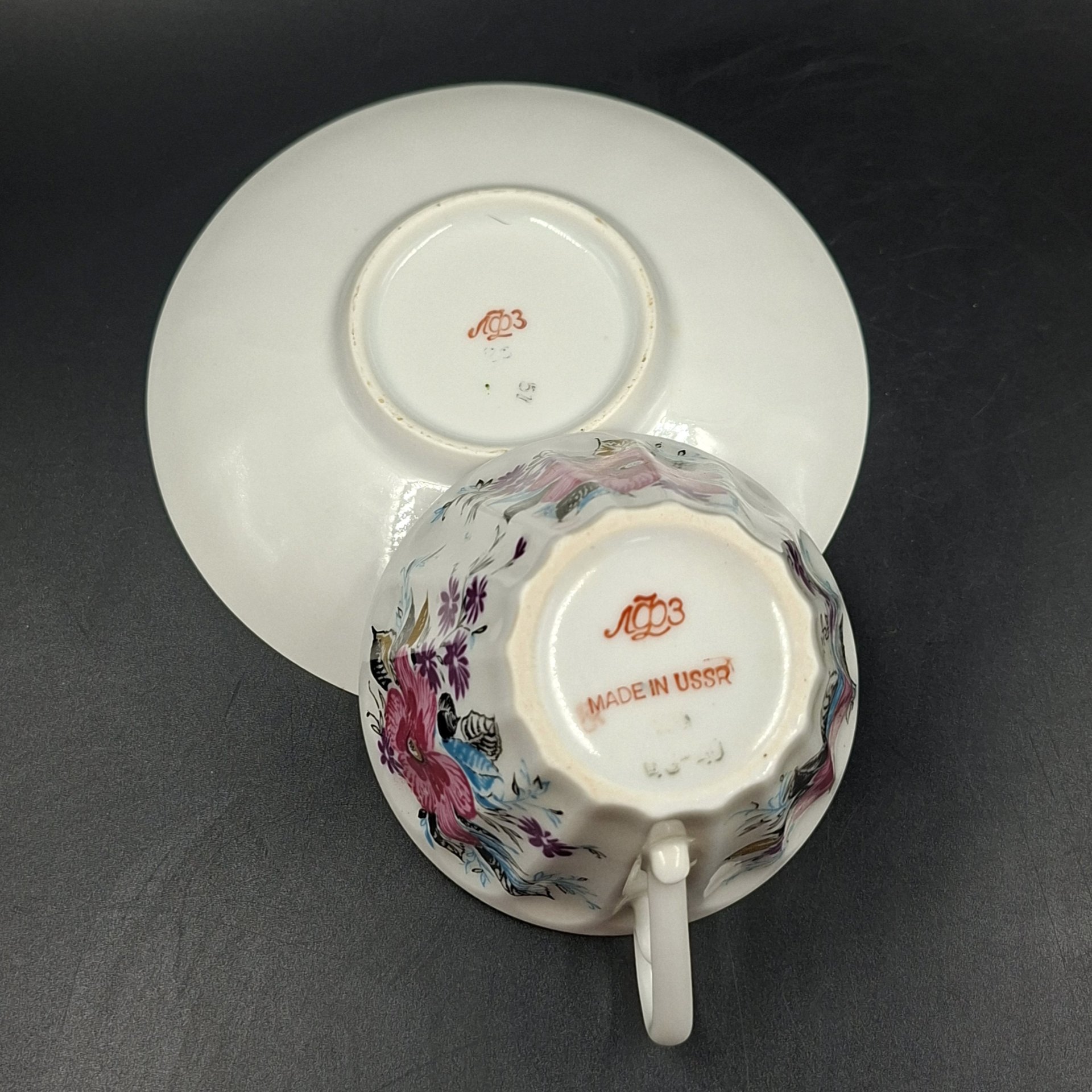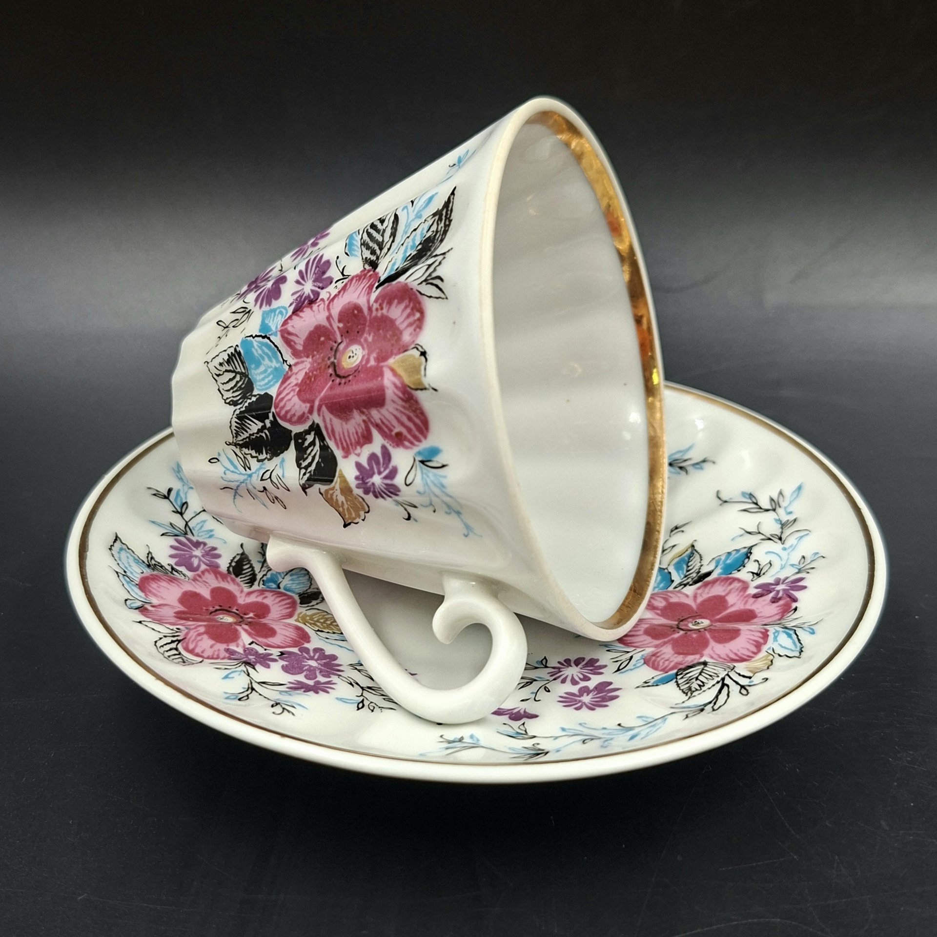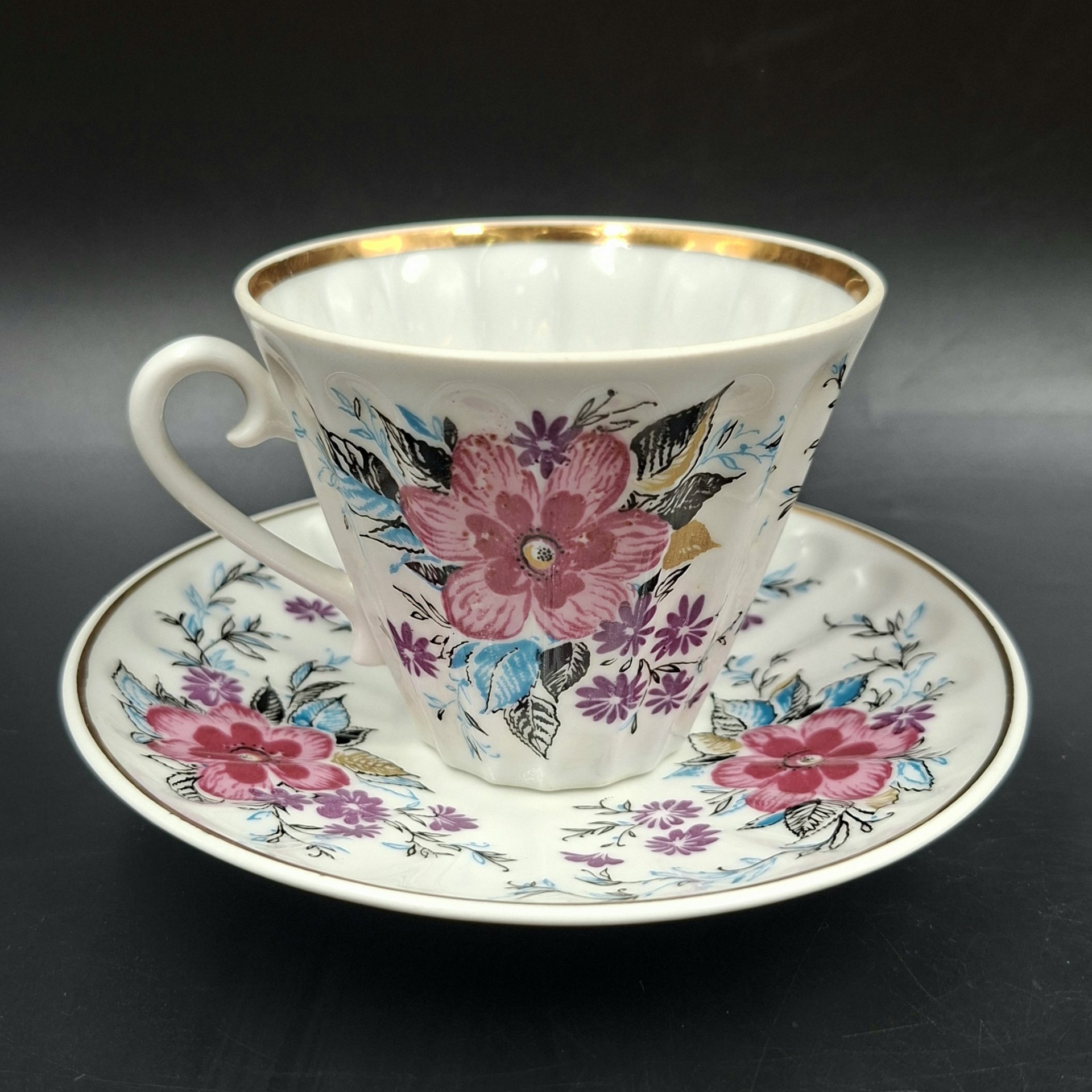 Чайная пара в подборе (блюдце "Ситец", чашка "Март"), форма "Лучистая", автор формы Н.П. Славина, фарфор, деколь, золочение, Ленинградский фарфоровый завод (ЛФЗ), СССР, 1970-1986 гг.