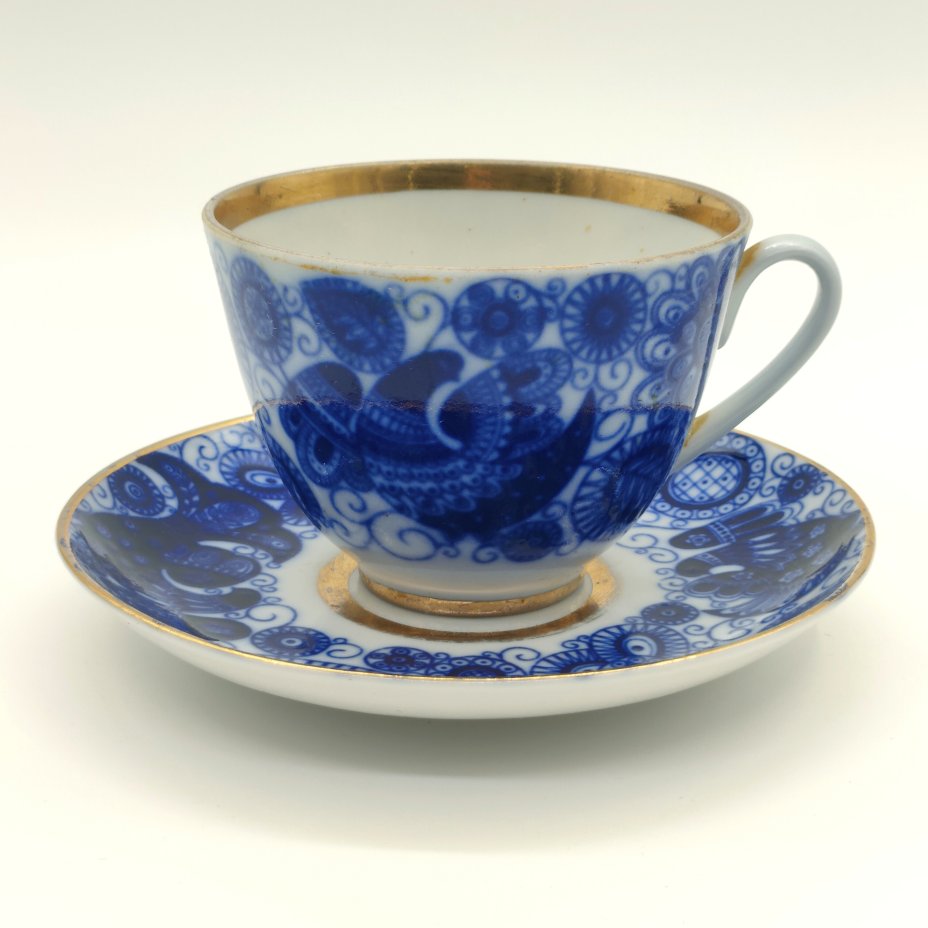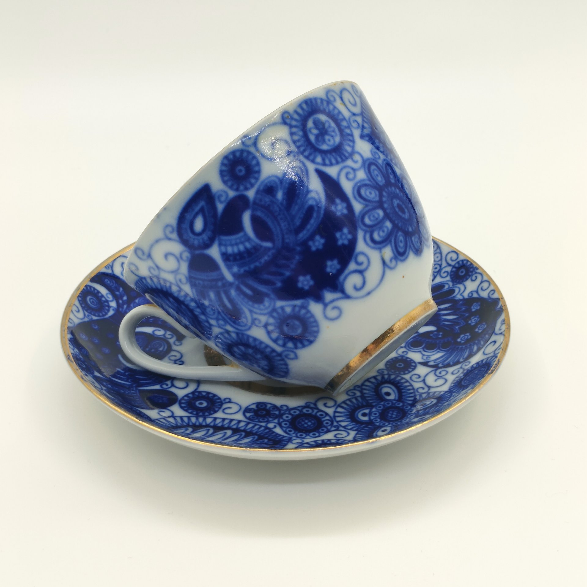 Чайная пара, украшенная изображением роз, кобальтовым декором и резным бортиком на блюдце, фарфор, люстр, золочение, деколь, Западная Европа, 1960-1990 гг.