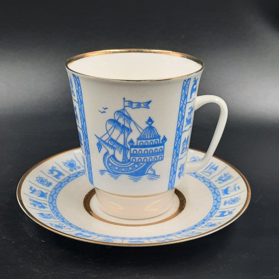Пара кофейная с декором в виде гирлянд (форма "Волна"), фарфор, деколь, Ленинградский фарфоровый завод (ЛФЗ), СССР, 1970-1992 гг.