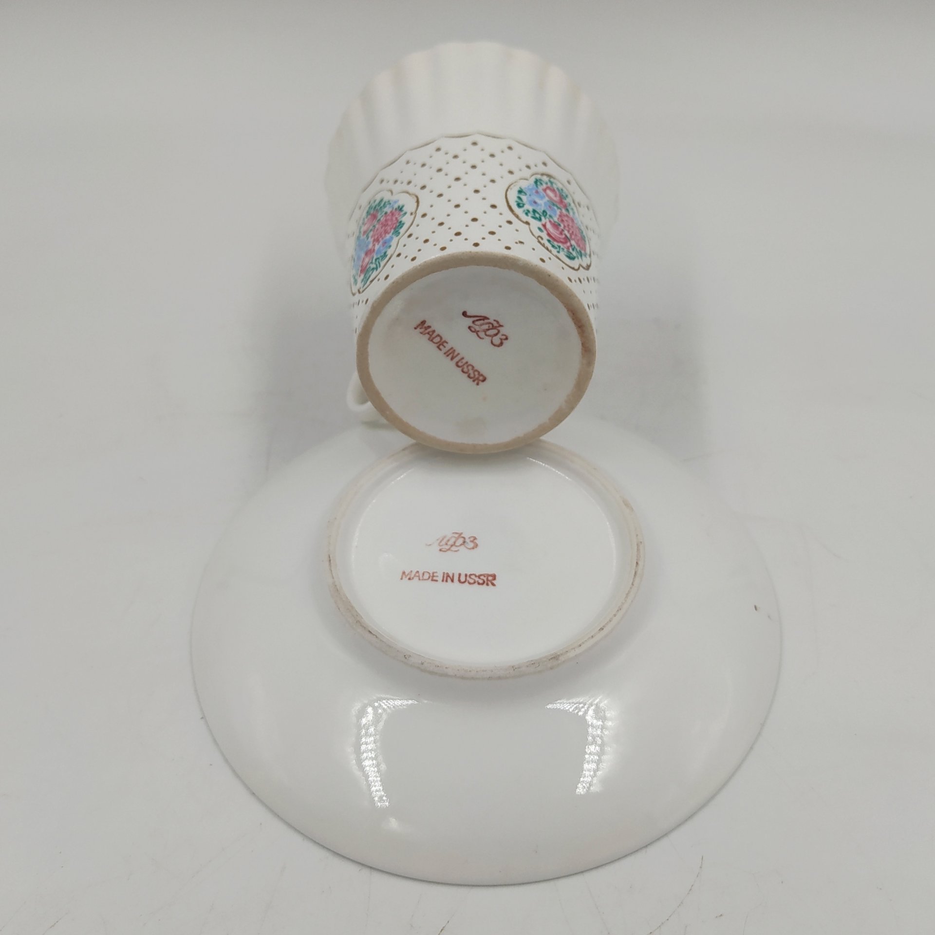 купить Пара кофейная с цветочным декором в резервах (форма "Одуванчик"), фарфор, деколь, золочение, Ленинградский фарфоровый завод (ЛФЗ), СССР, 1970-1992 гг.