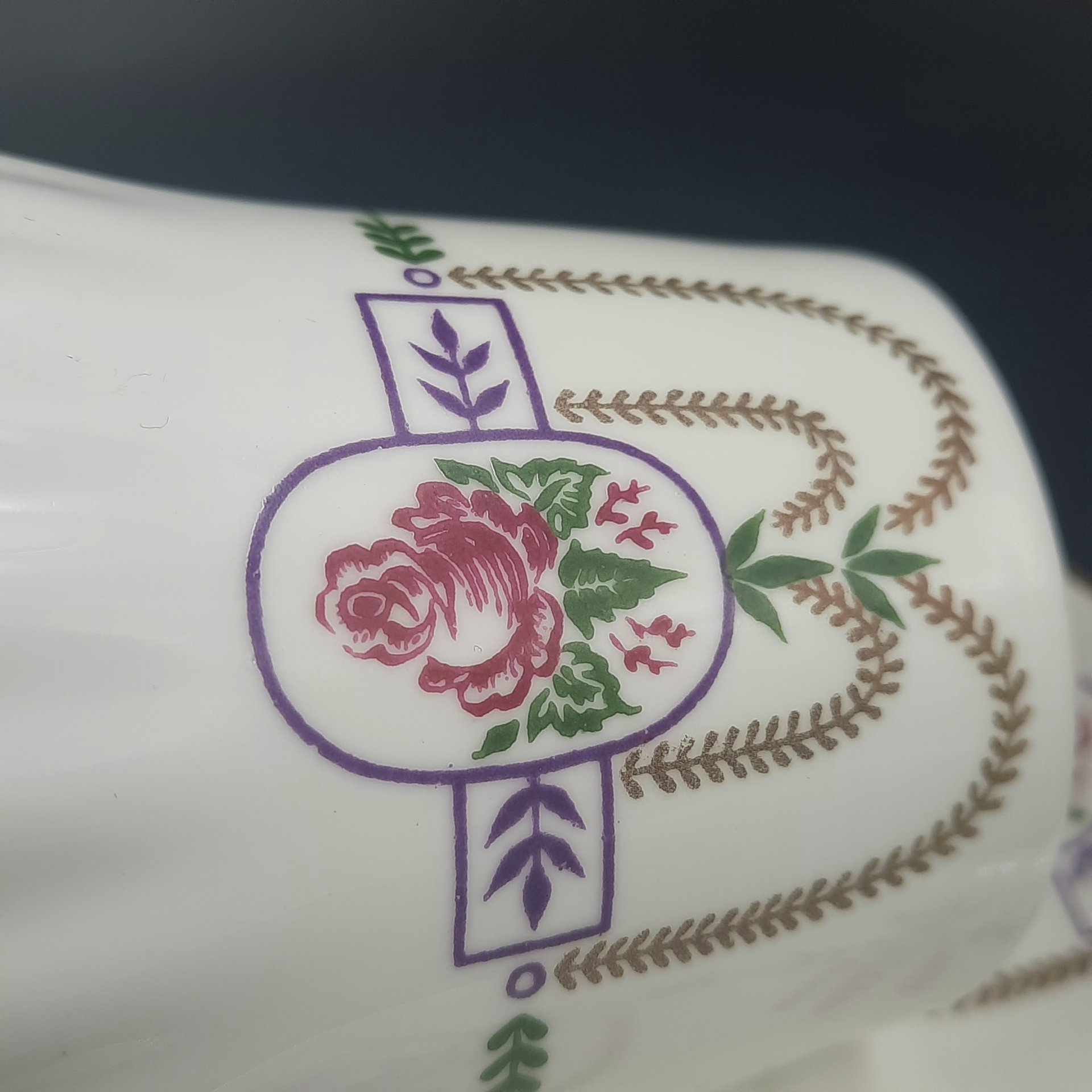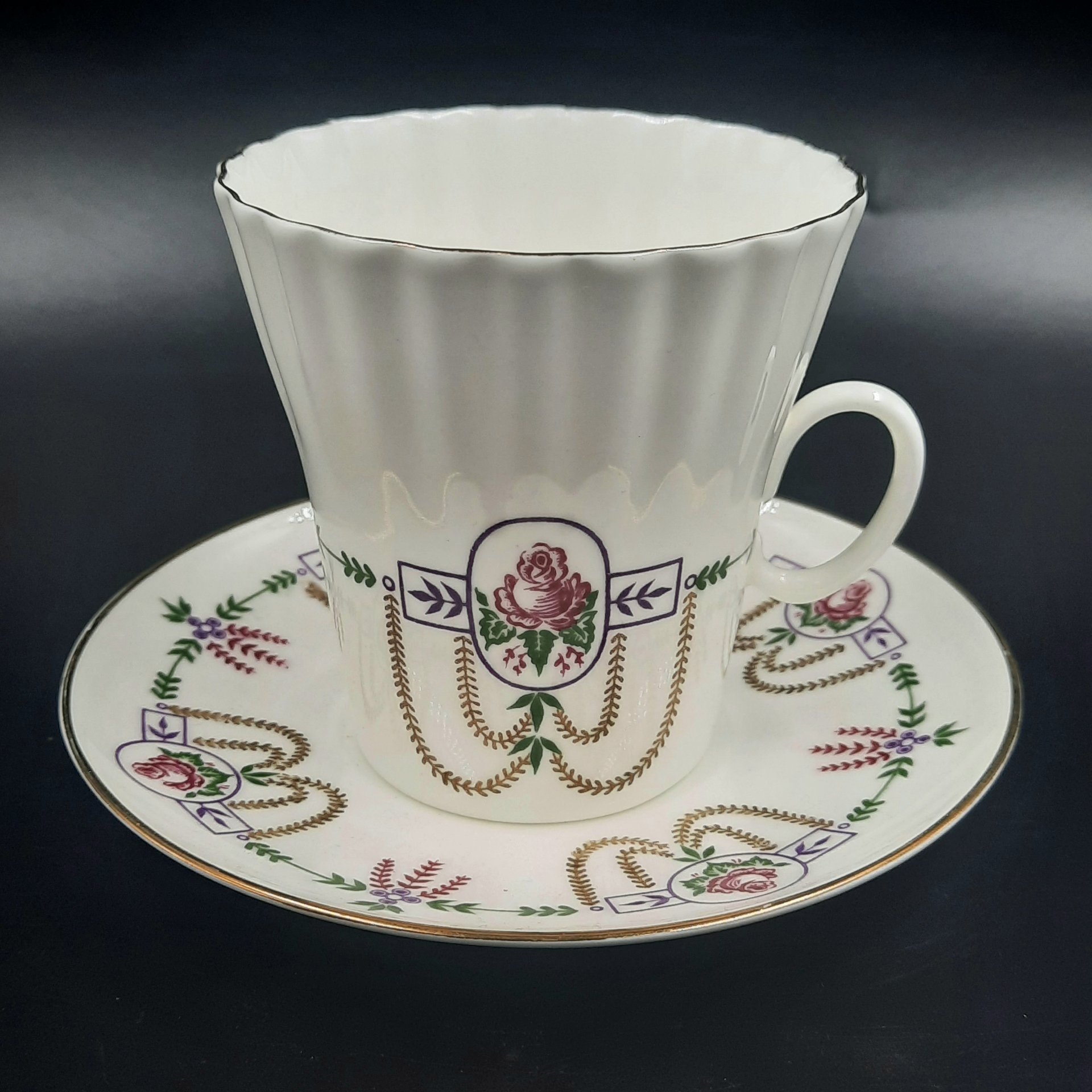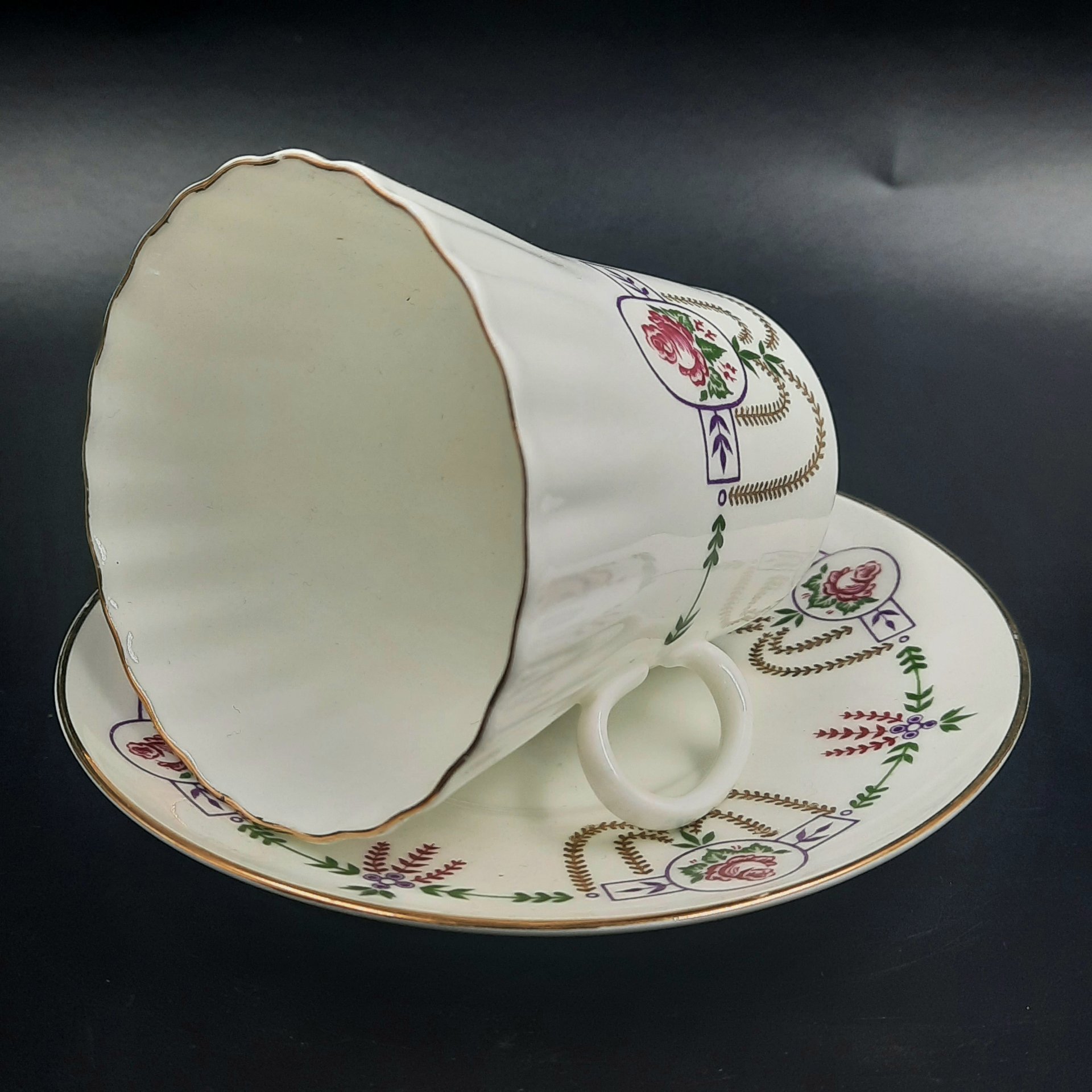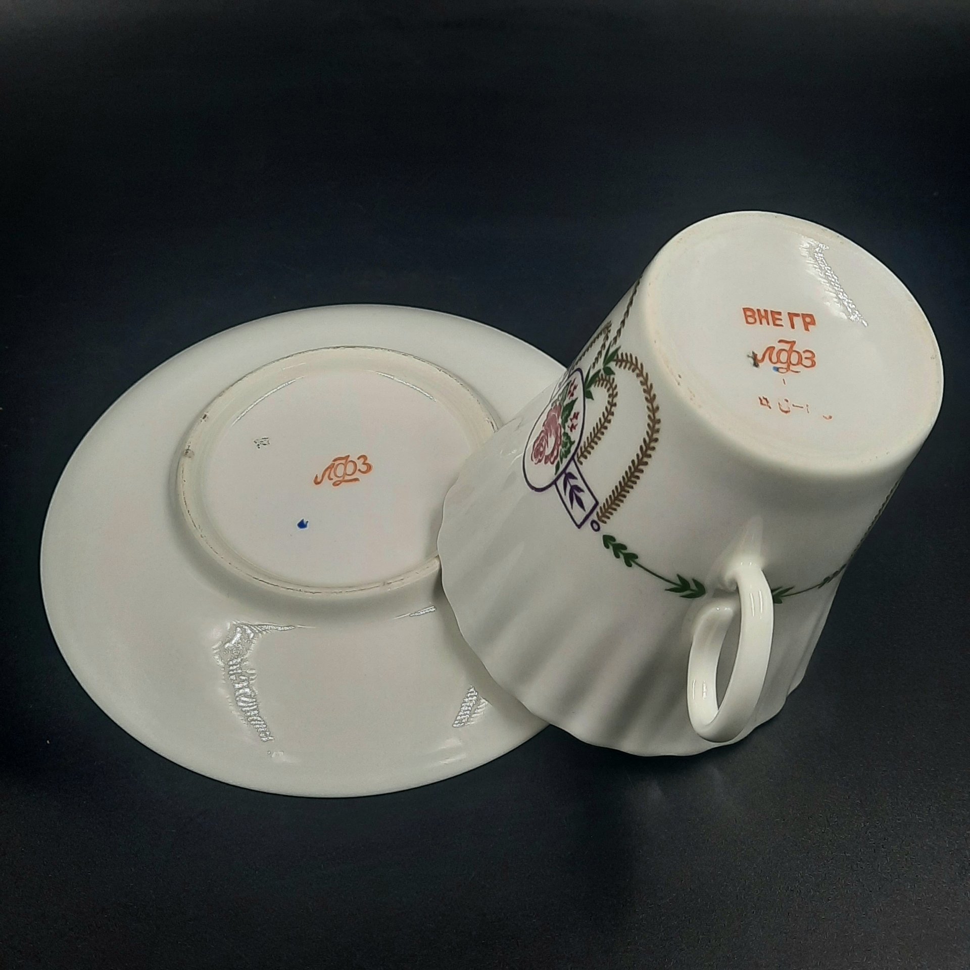 Пара кофейная с декором в виде гирлянд (форма "Волна"), фарфор, деколь, Ленинградский фарфоровый завод (ЛФЗ), СССР, 1970-1992 гг.