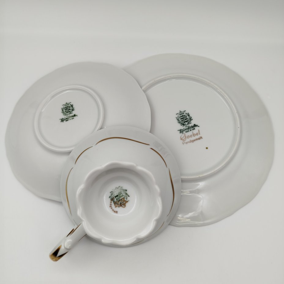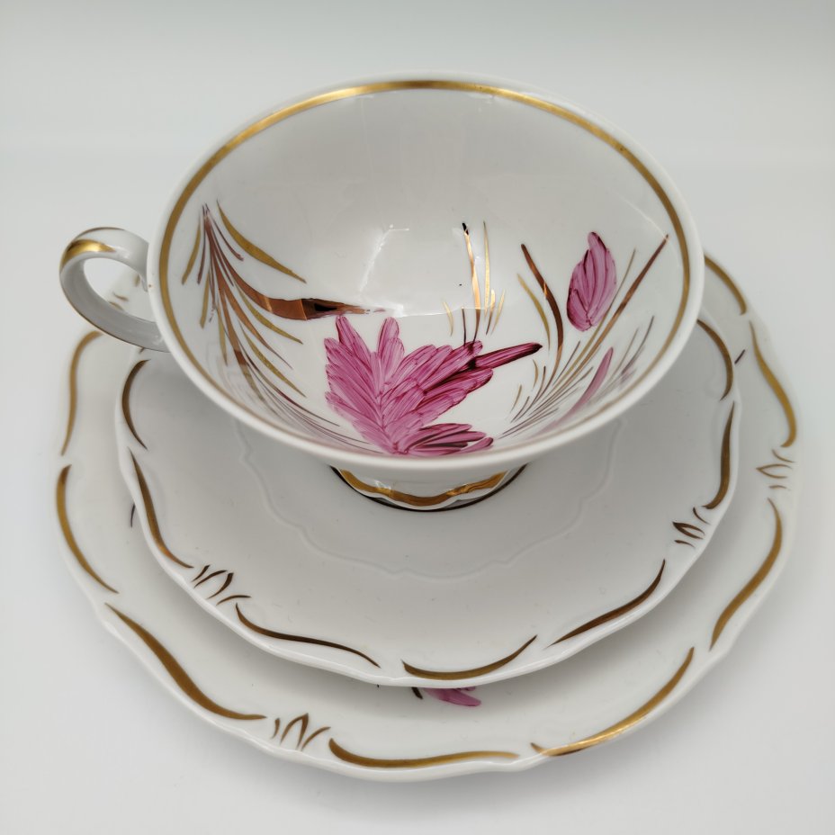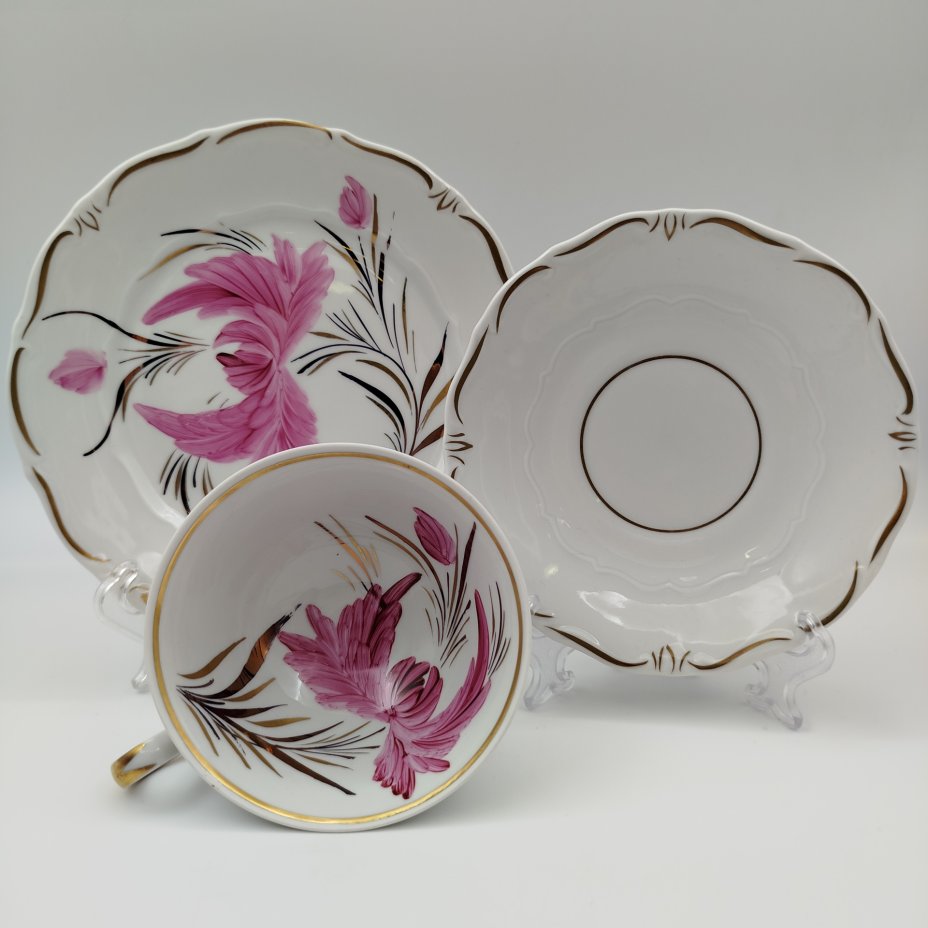 Трио чайное с цветочным декором пурпурного оттенка, фарфор, роспись, золочение, Weimar Porzellan (Веймарский фарфор), ГДР, 1949-1980 гг.