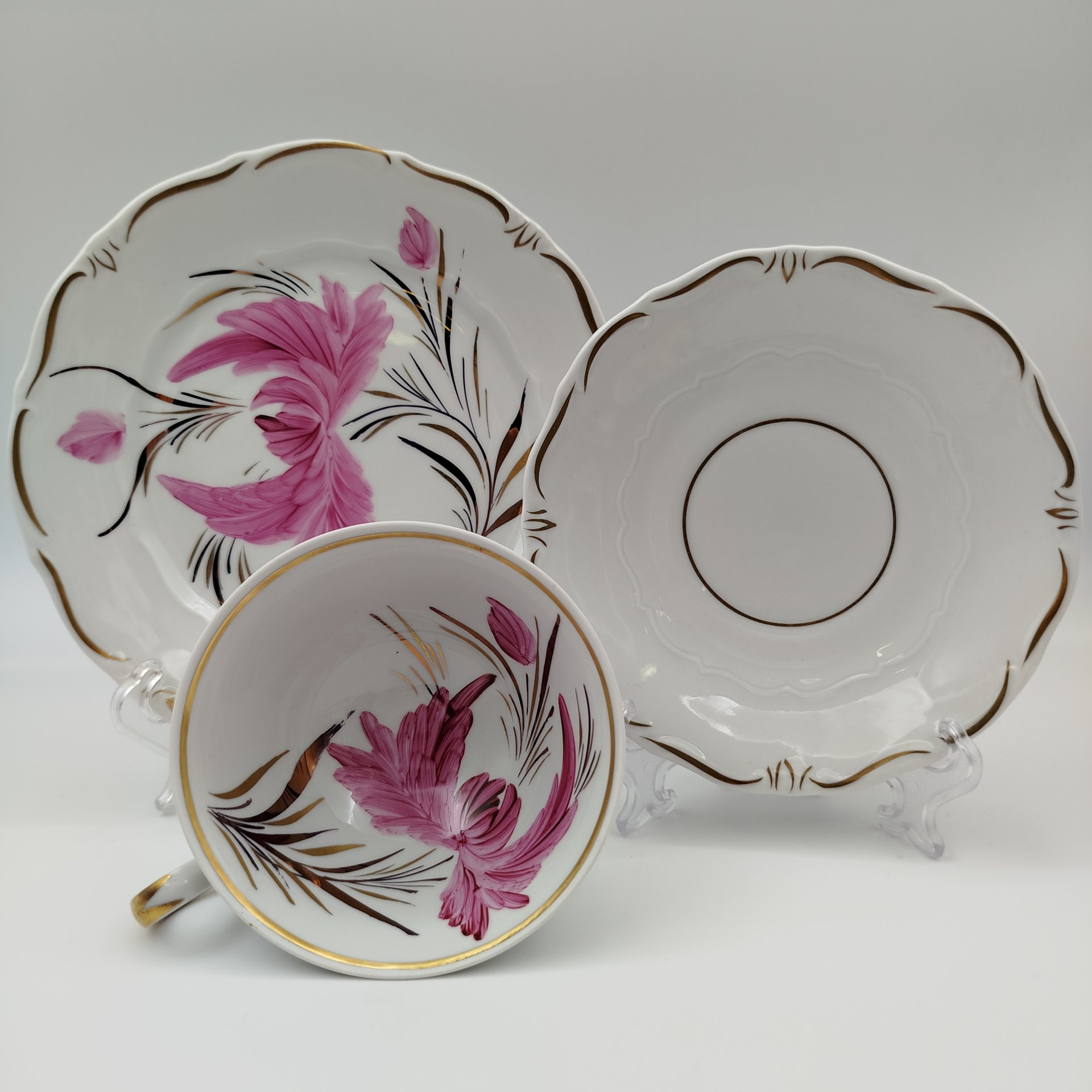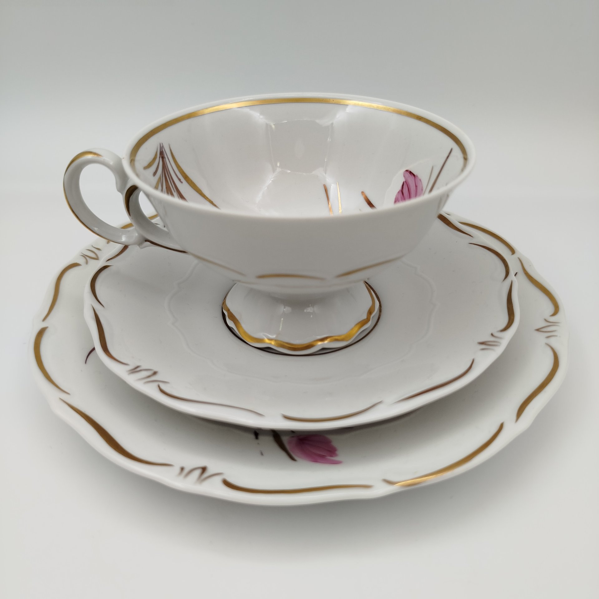Купить Трио чайное с цветочным декором пурпурного оттенка, фарфор, роспись, золочение, Weimar Porzellan (Веймарский фарфор), ГДР, 1949-1980 гг.