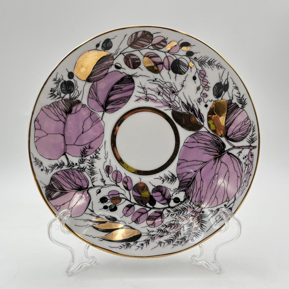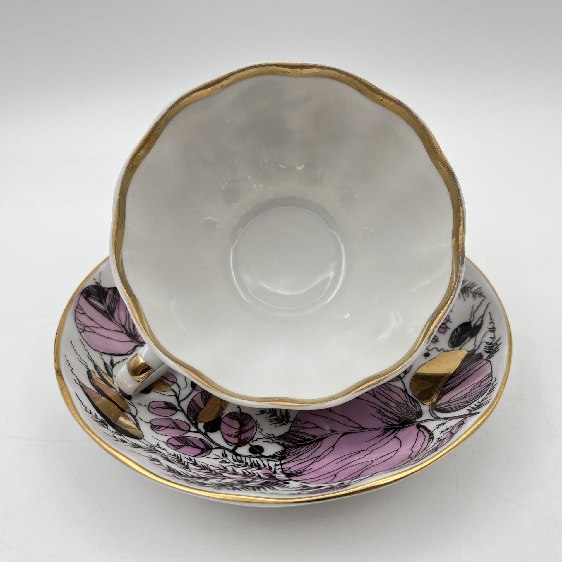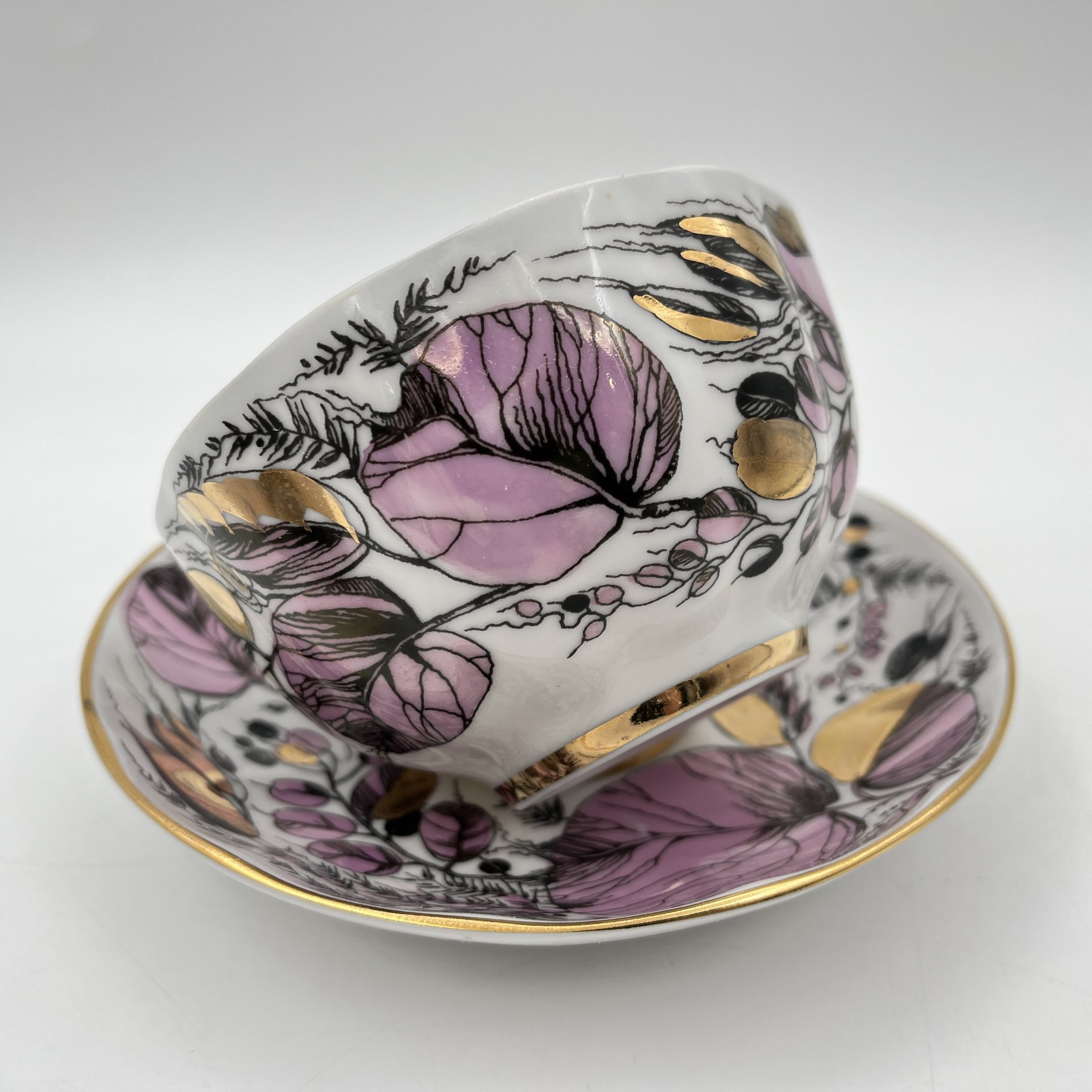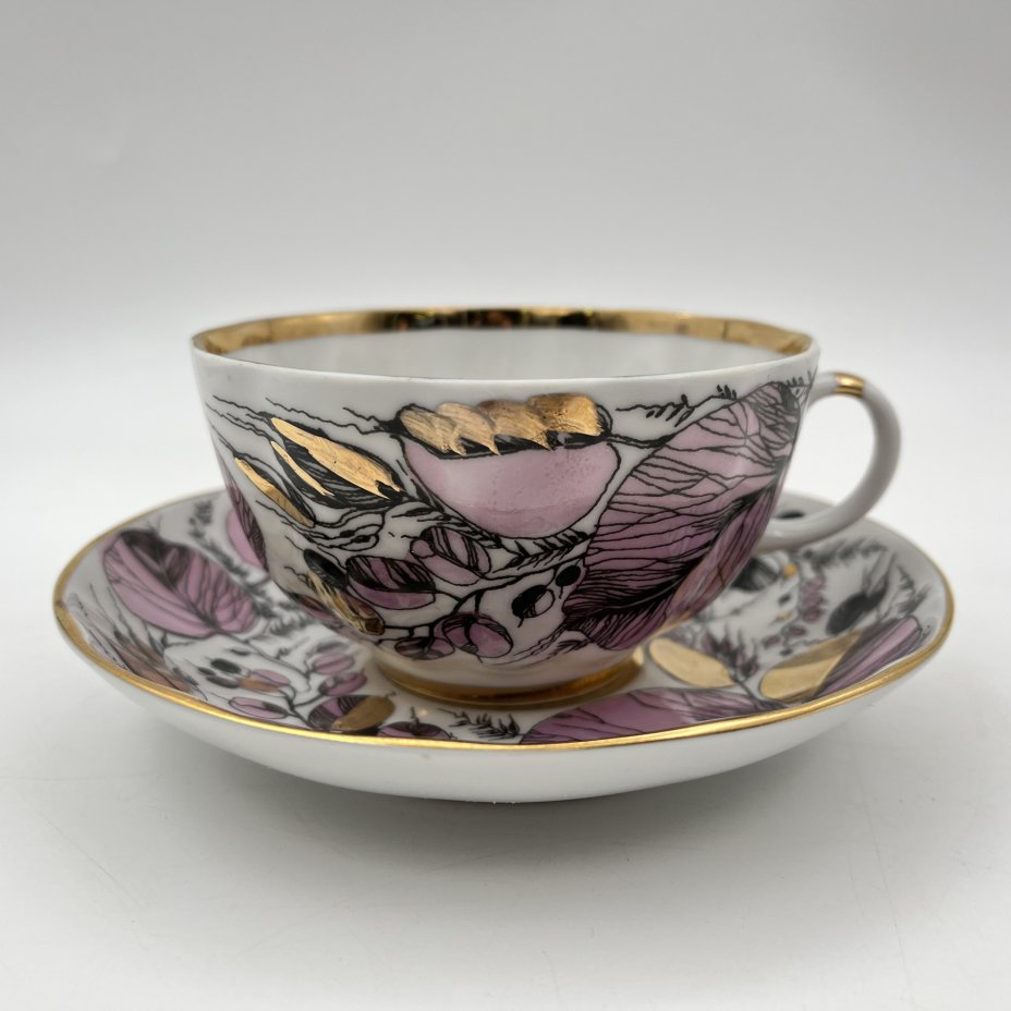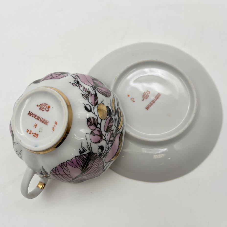 Чайная пара "Мой сад" в розовом оттенке, (из серии "Времена года"), форма "Тюльпан", автор формы С.Е. Яковлева, автор росписи Н.П. Славина, фарфор, деколь, люстр, золочение, Ленинградский фарфоровый завод (ЛФЗ), СССР, 1970-1991 гг.