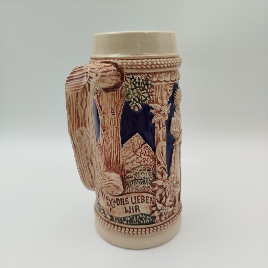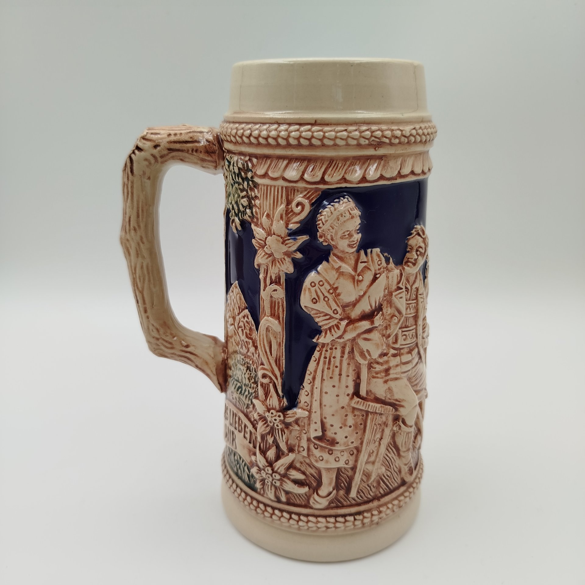 Кружка пивная с изображением сцены флирта и шуточной надписью: "Всегда пейте с толком - никогда не слишком мало, никогда не слишком много", керамика, рельеф, крышка - олово, Marzi & Remy, Германия, 1964-1990 гг.