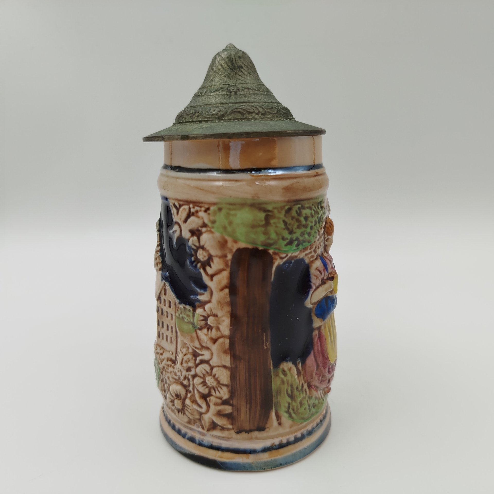 Кружка пивная , украшенная изображением сцены флирта в трактире, керамика, рельеф, люстр, Marzi & Remy, Германия, 1964-1990 гг.