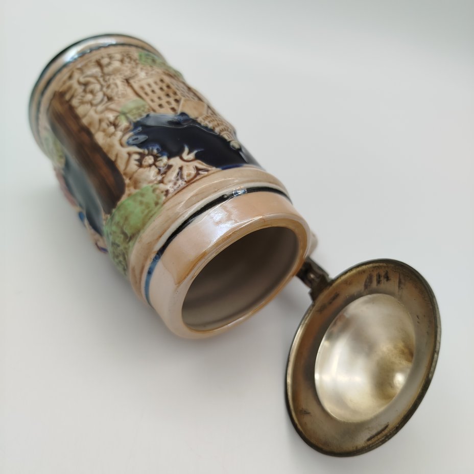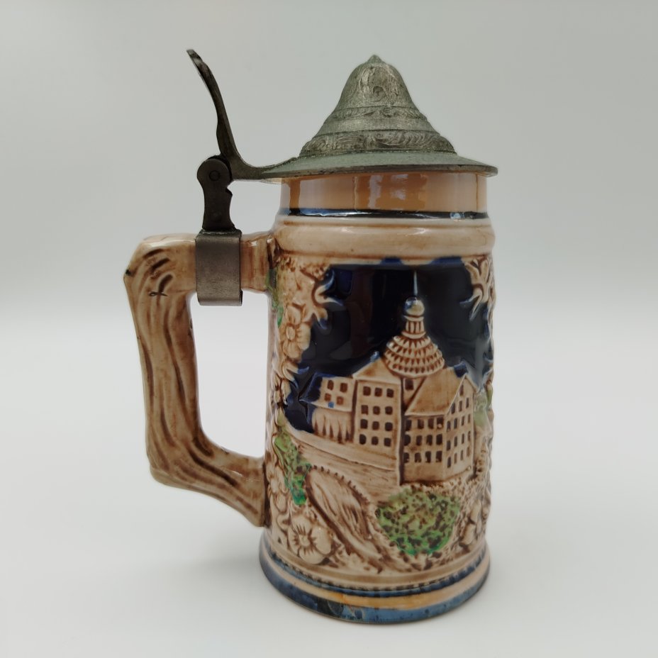 Кружка пивная, украшенная изображениями достопримечательностей Брюсселя, керамика, рельеф, крытье, люстр, крышка - металл, Marzi & Remy, Германия, 1964-1990 гг.