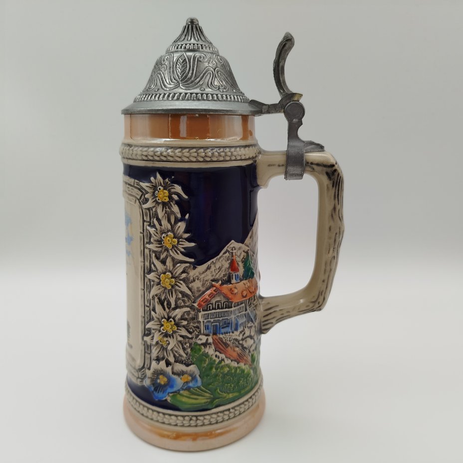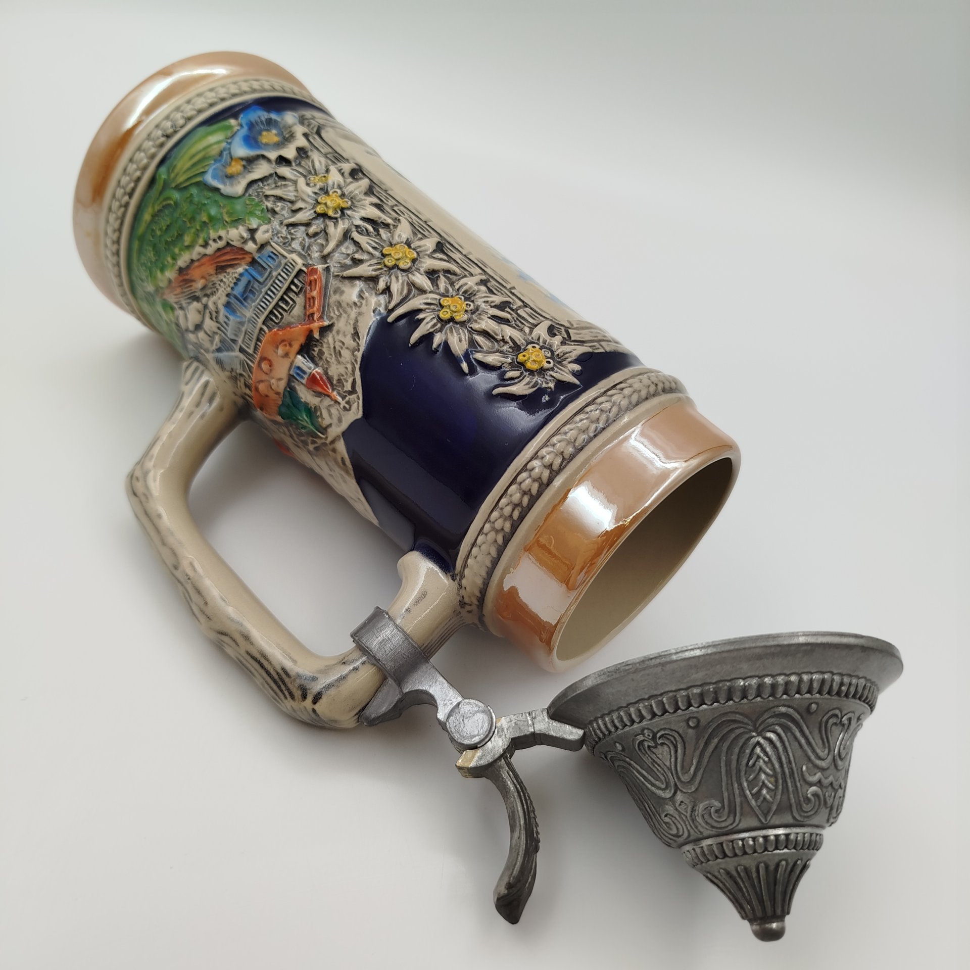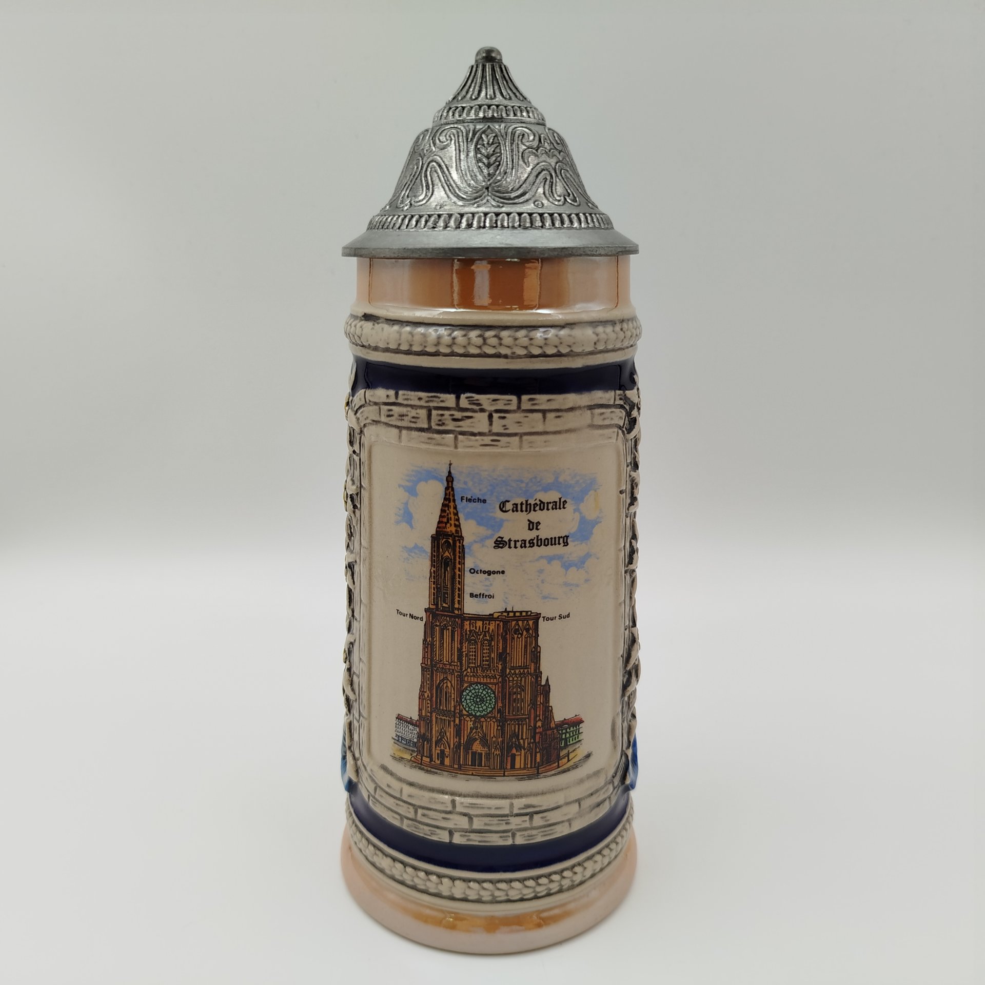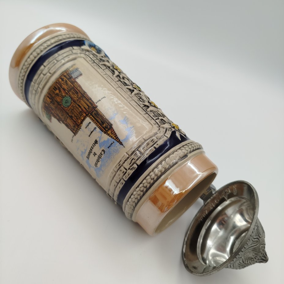 Кружка пивная, украшенная изображениями достопримечательностей Брюсселя, керамика, рельеф, крытье, люстр, крышка - металл, Marzi & Remy, Германия, 1964-1990 гг.