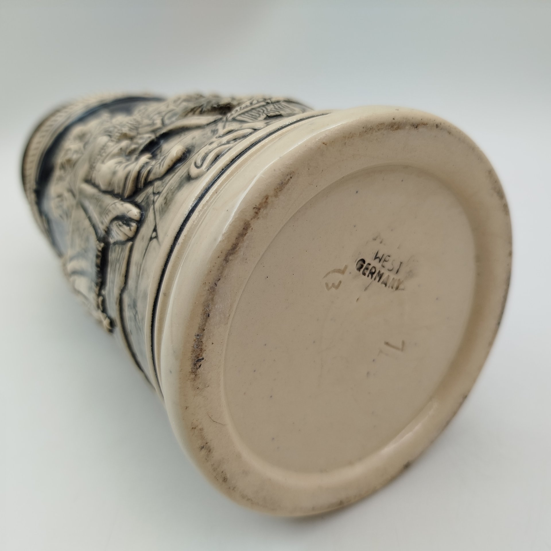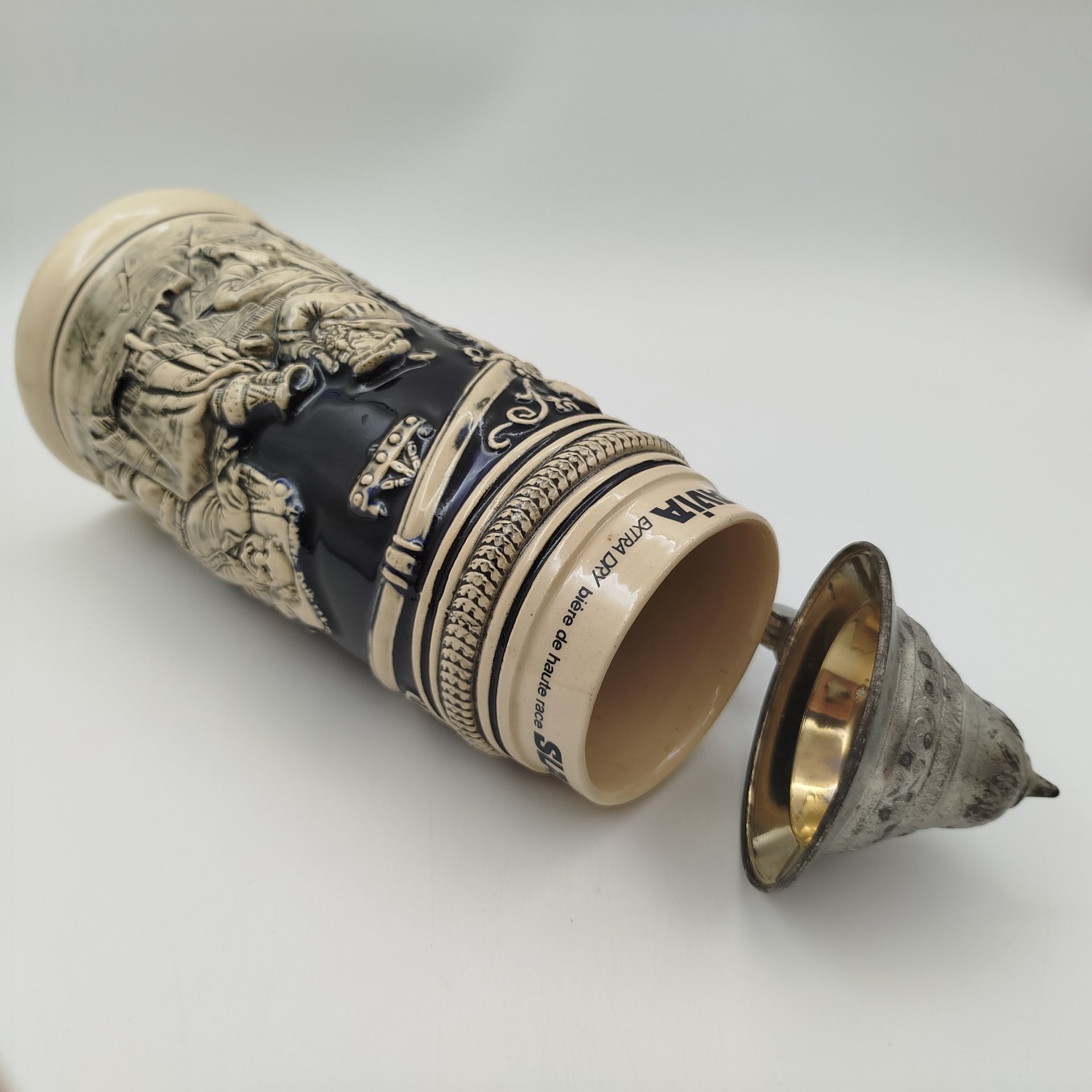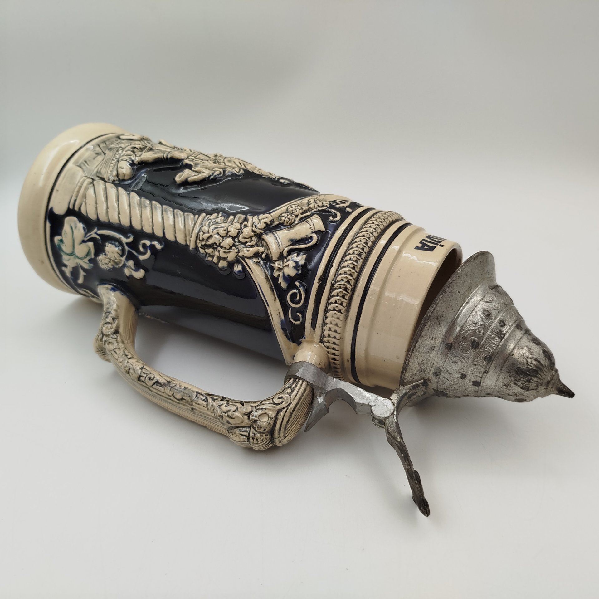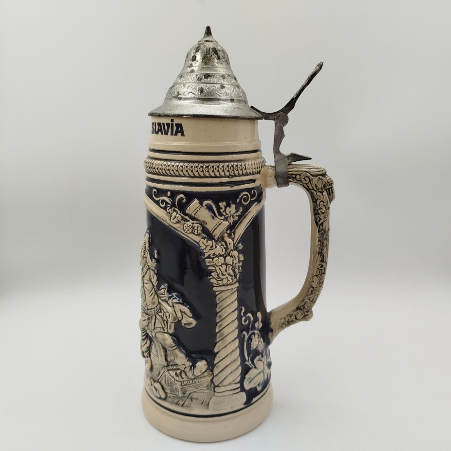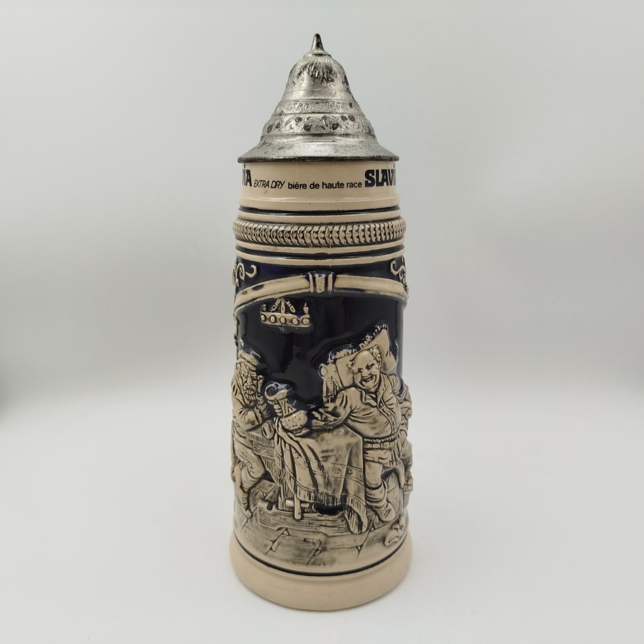 Кружка пивная с крышкой, декорированная трактирной сценкой, керамика, крытье, сплав металлов, Германия, 1960-1990 гг.