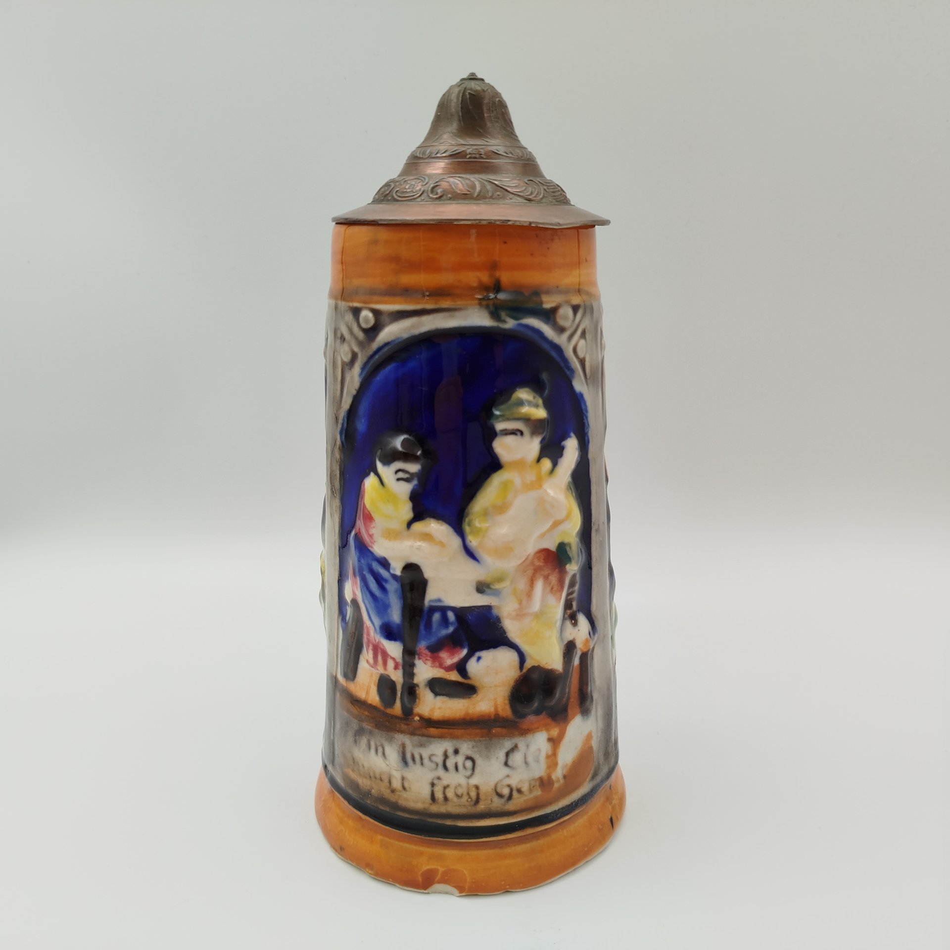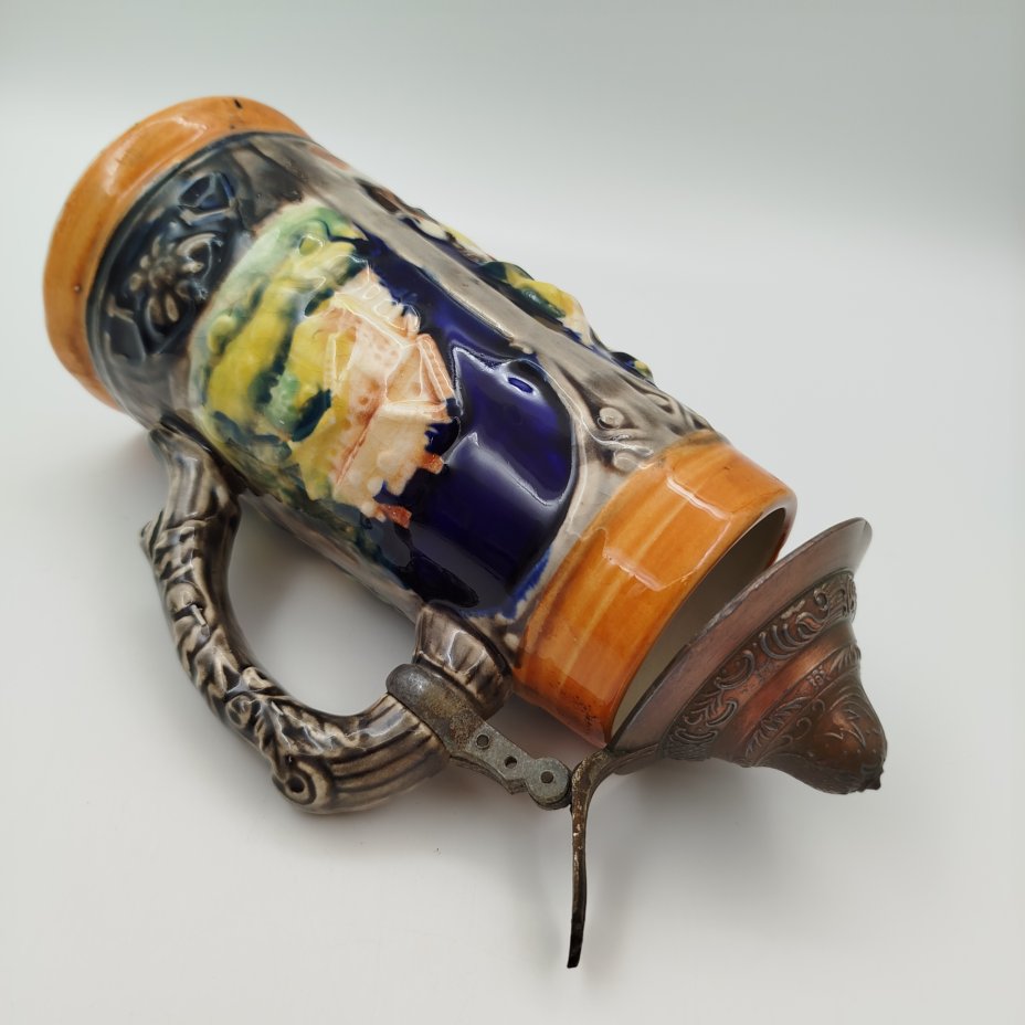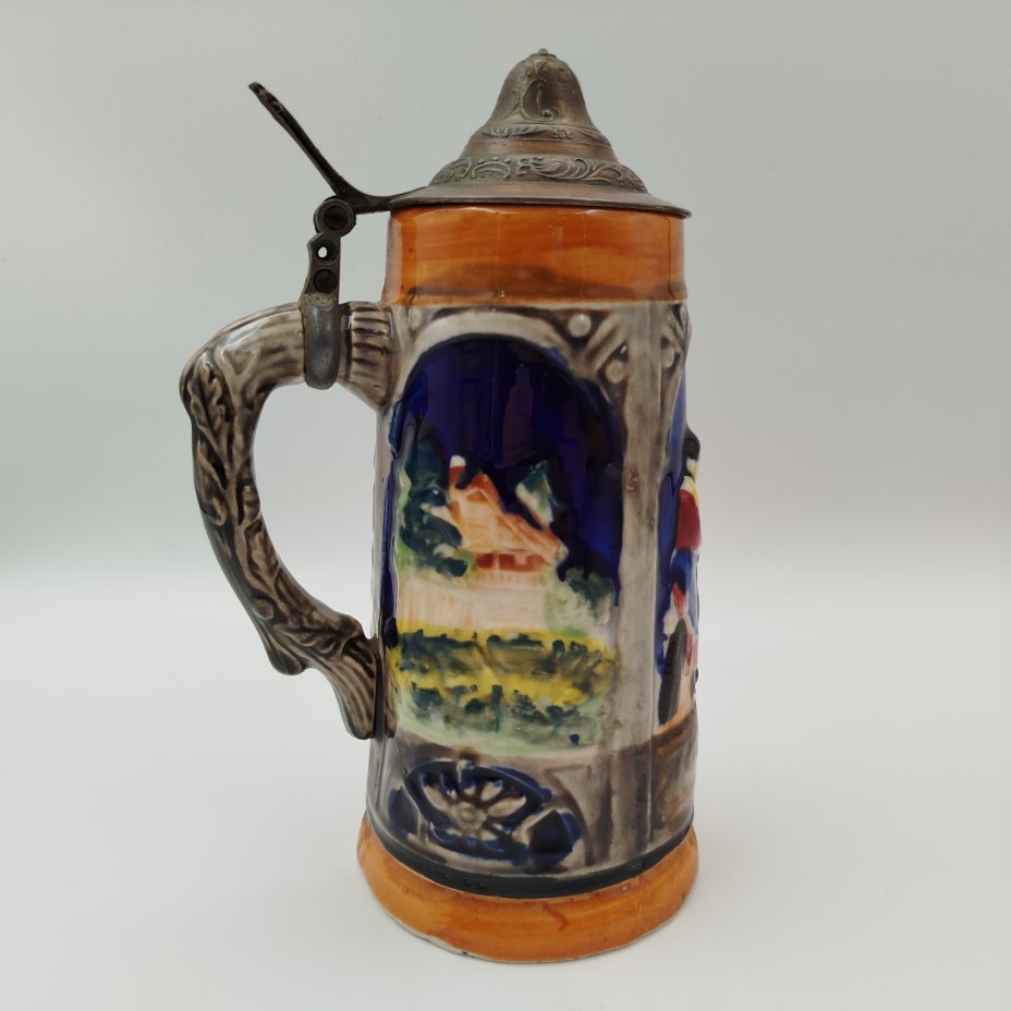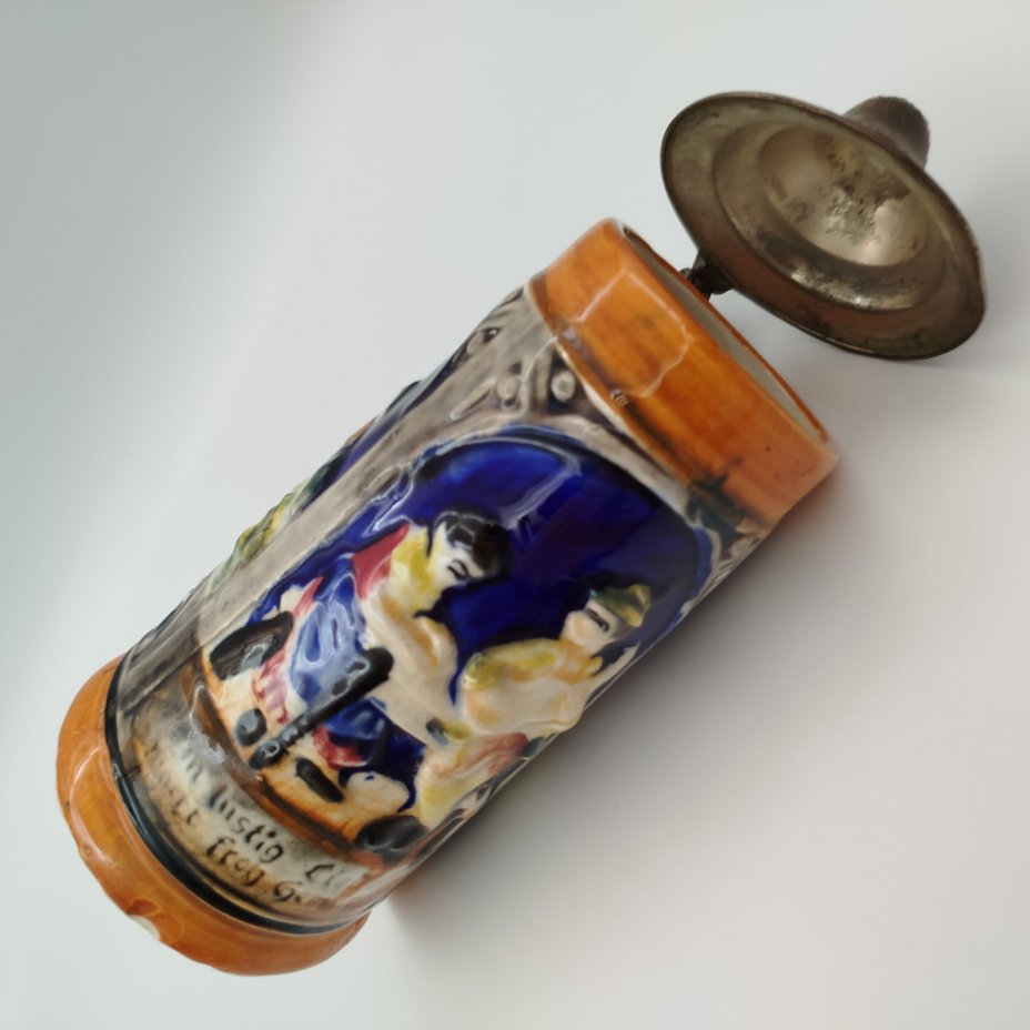 Кружка пивная , украшенная изображением сцены флирта в трактире, керамика, рельеф, люстр, Marzi & Remy, Германия, 1964-1990 гг.