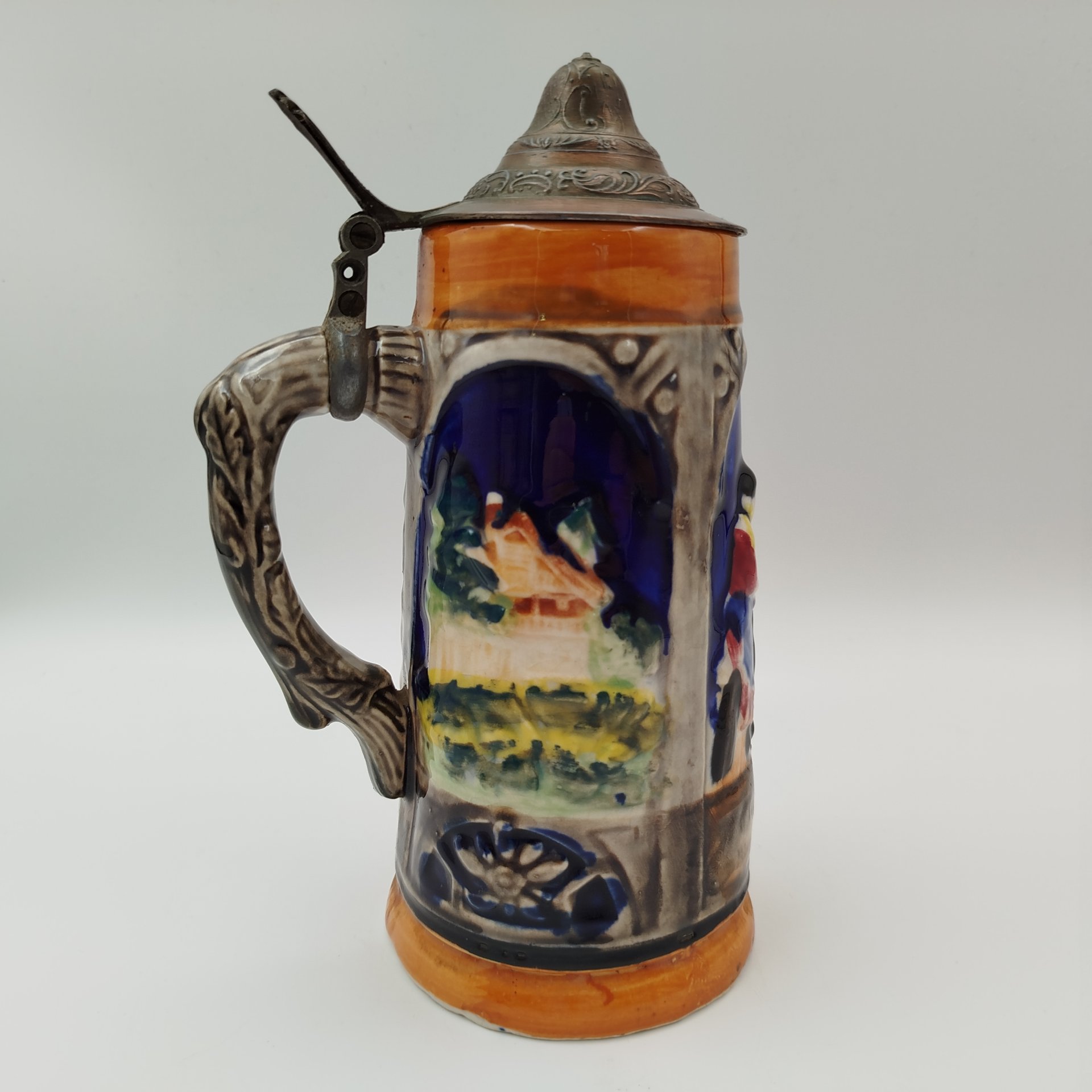 Кружка пивная, украшенная изображениями достопримечательностей Брюсселя, керамика, рельеф, крытье, люстр, крышка - металл, Marzi & Remy, Германия, 1964-1990 гг.