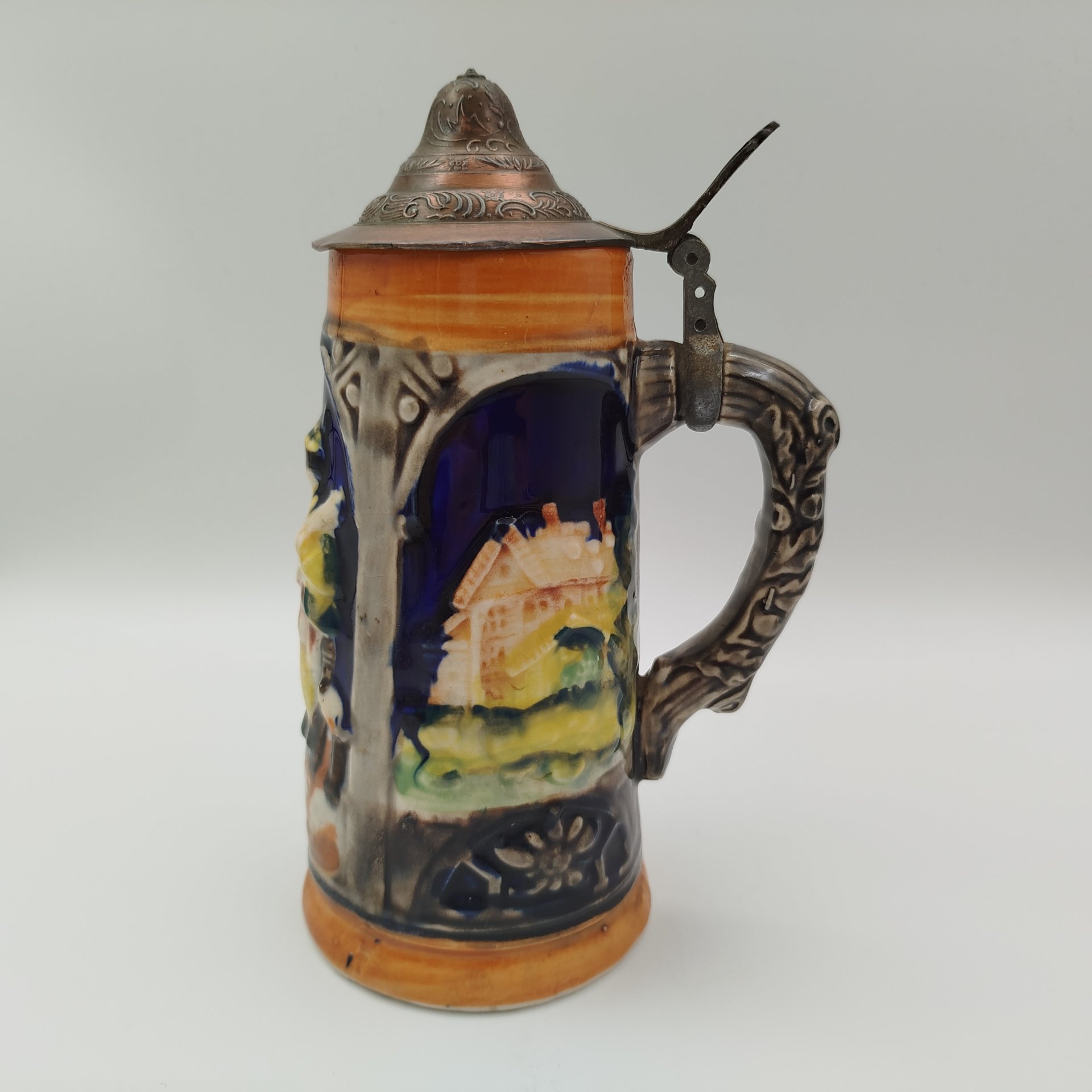 Кружка пивная с изображением сцены флирта (Прощание охотника), керамика, рельеф, Marzi & Remy, Германия, 1964-1990 гг.