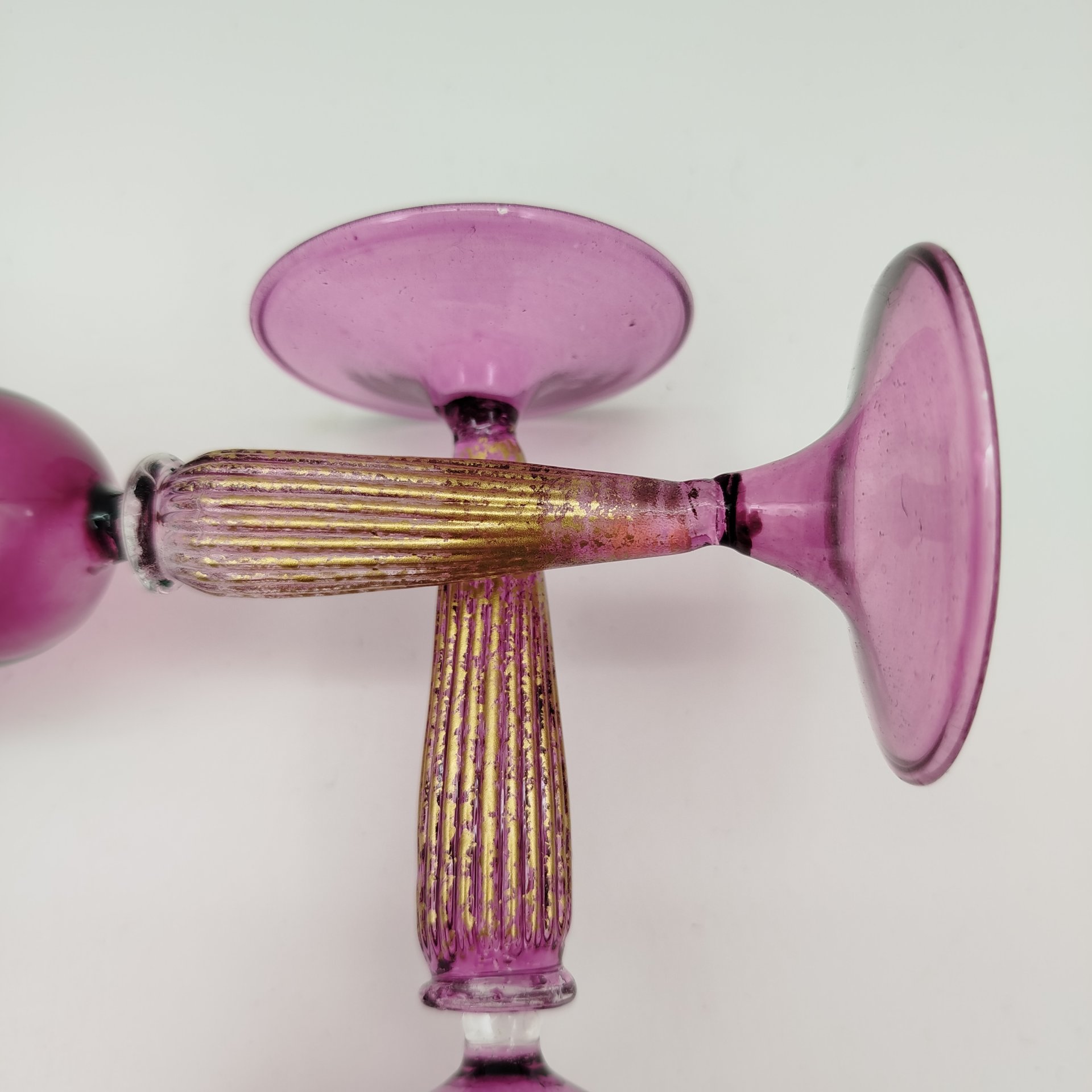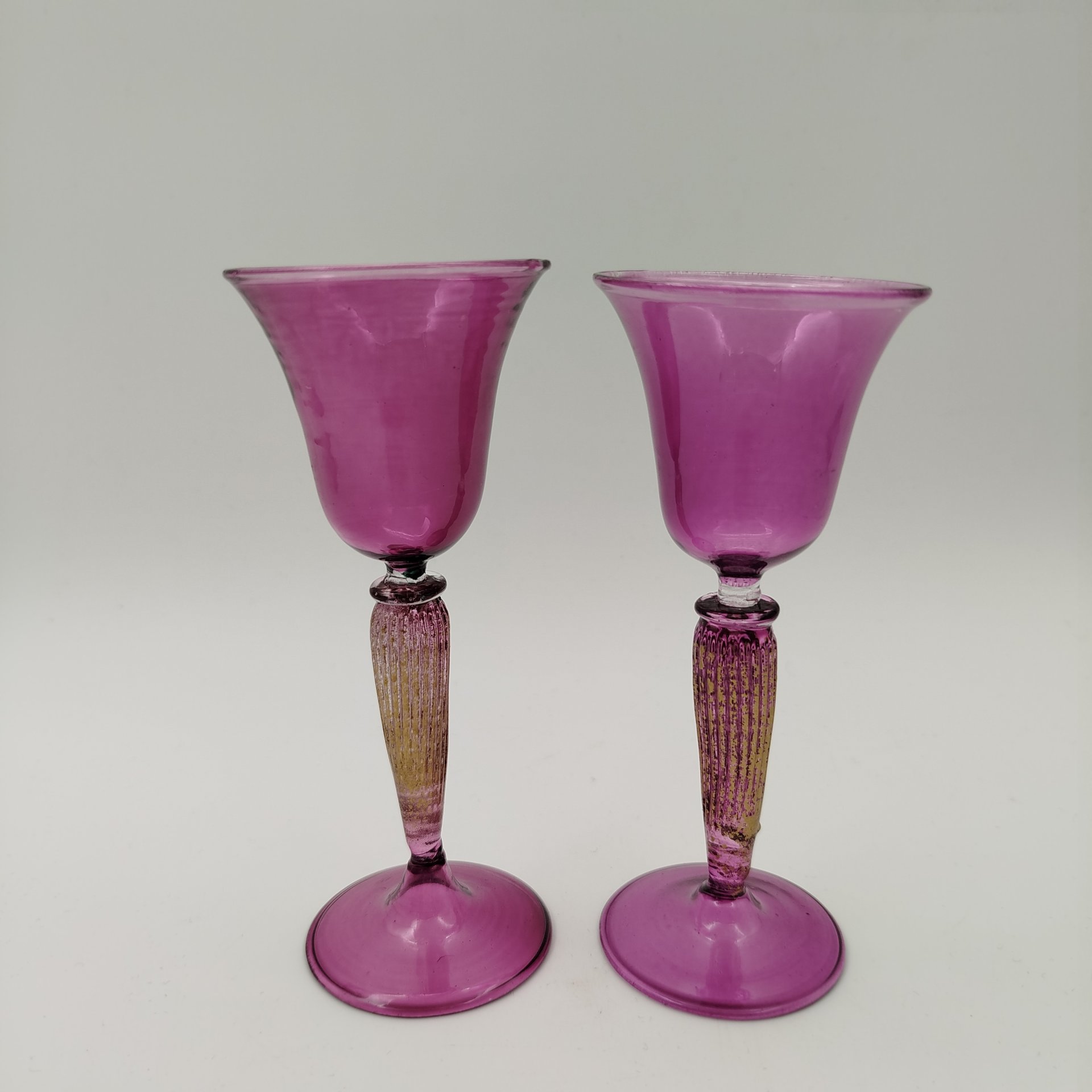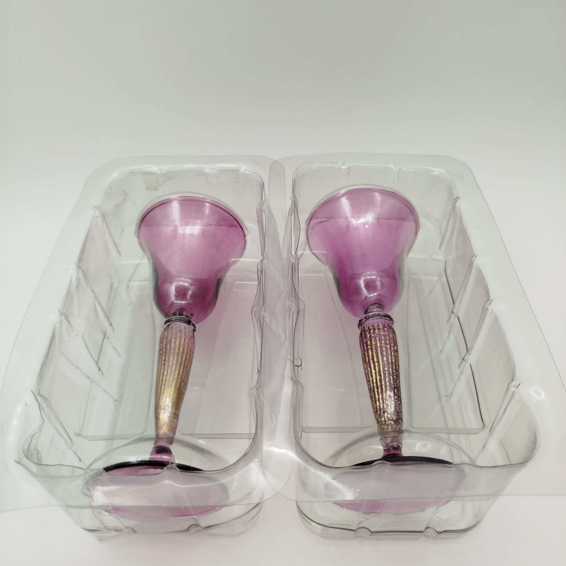 Две рюмки на высоких ножках, для подачи ликера. Витая ножка укращена золочением. Объем рюмки 25-30мл. В пластиковой упаковке.