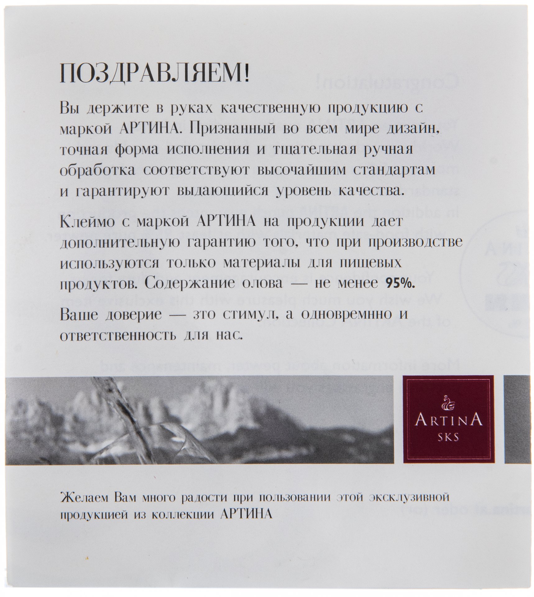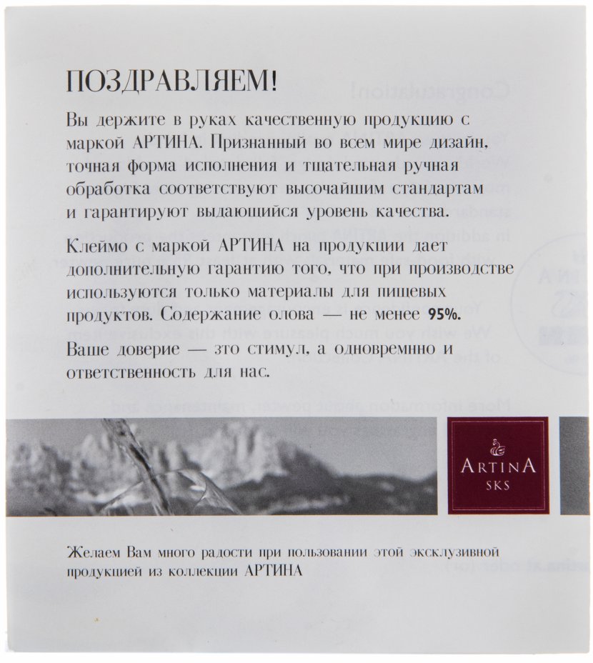 К набору прилагается сообщение на бумажном носителе от фирмы "Артина".