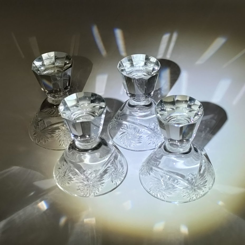 Набор из 4-х стопок с массивными гранёными ножками со звездчатым декором, хрусталь, алмазная грань, СССР, 1960-1990 гг.
