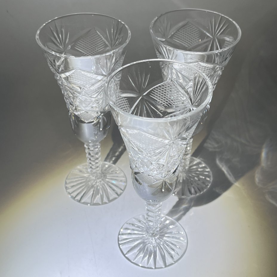Рюмки на ножках с геометрическим декором 3 шт., хрусталь, пресс, алмазная грань, СССР, 1970-1990 гг.